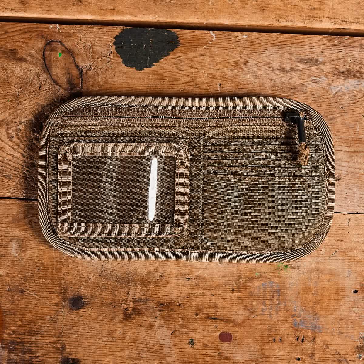 The "Admin Panels" by GORUCK, an ideal EDC accessory, boasts a zipper compartment and a clear ID pouch. It rests on a rustic wooden surface with visible scratches and paint marks.