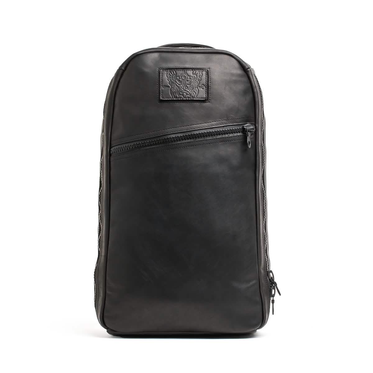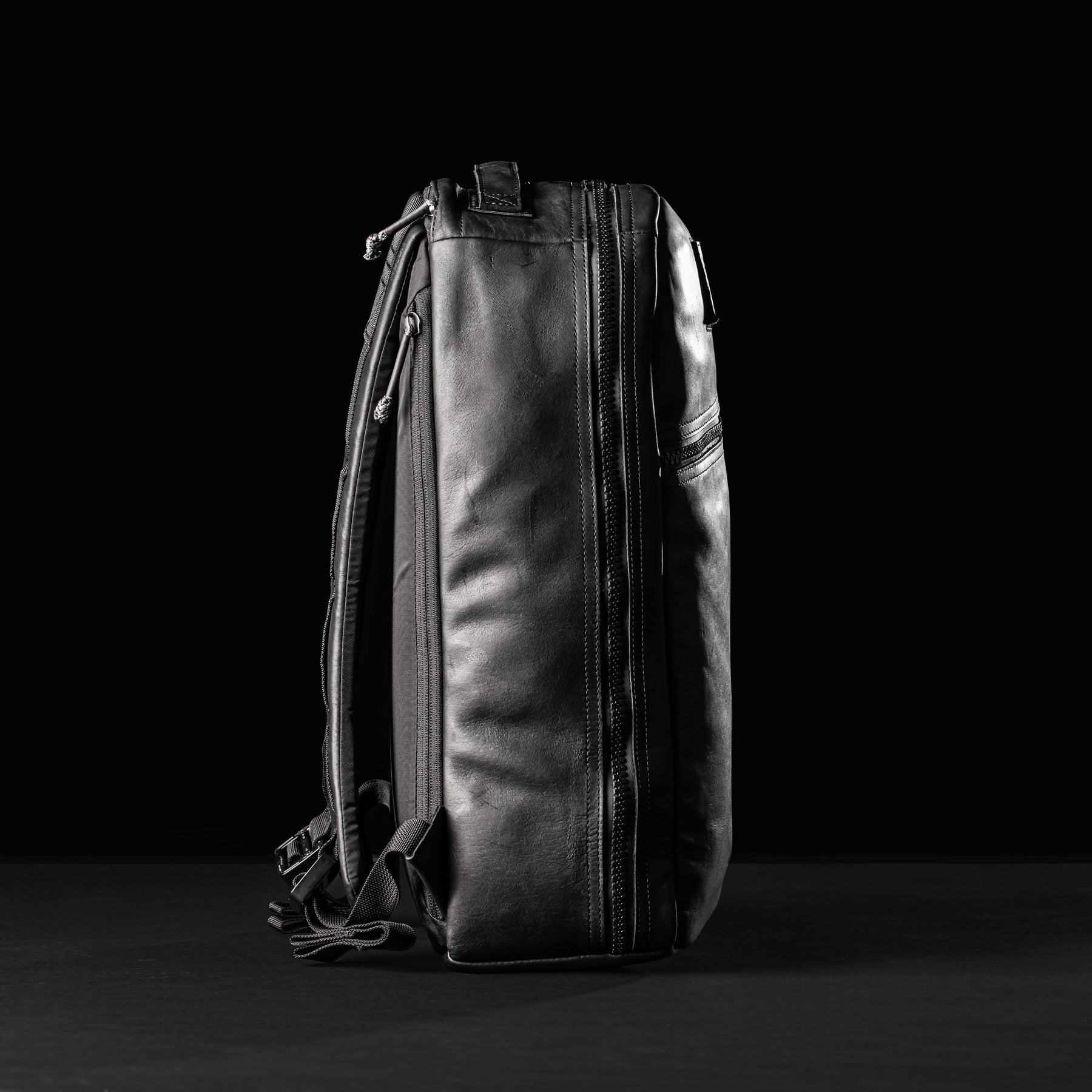 Side view of a sleek black leather Bullet Ruck x Carryology - Berserker Viking by GORUCK against a dark background. The backpack features visible zippers and adjustable straps, highlighting its modern and minimalist design.