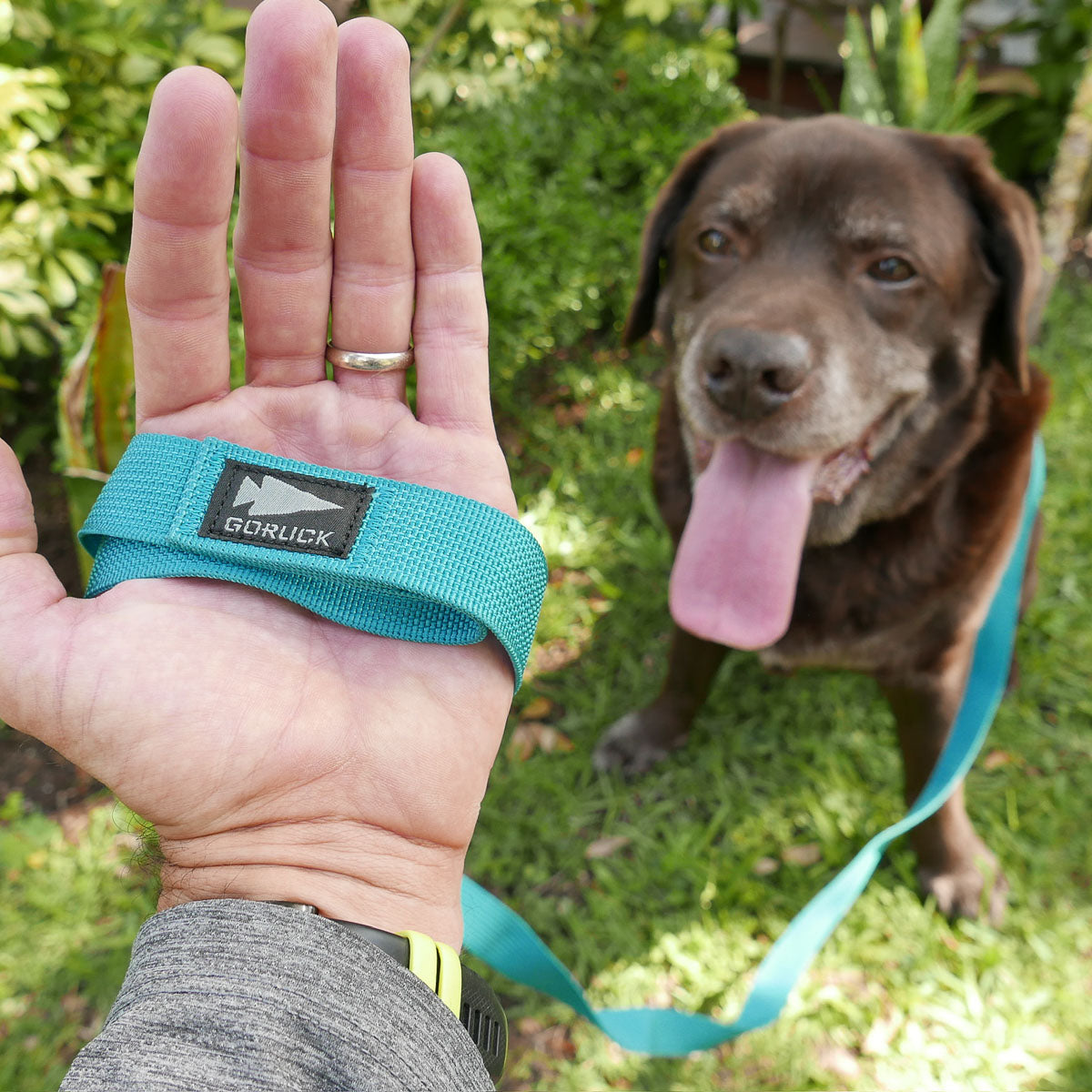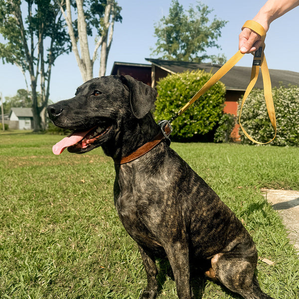 A hand holds the Dog Leash, crafted from military-grade nylon, while a happy brown dog pants and stands on grass in the background.