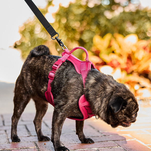 A close-up of a light brown dog with dark spots reveals a GORUCK black harness crafted from military-grade nylon, securely attached to the GORUCK Small Dog Leash in teal. The vibrant, multicolored brick ground enhances the charm of this small dog's adventure.
