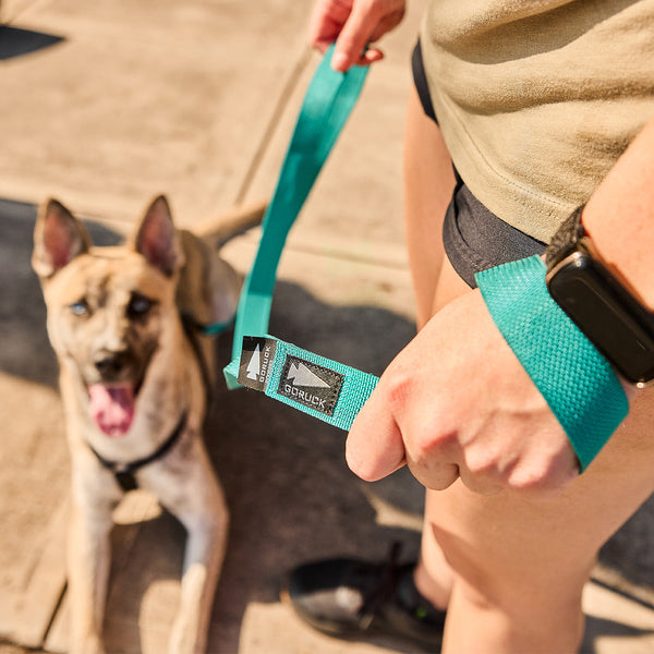 Brown dog sitting on pavement, tongue out, with a turquoise Dog Leash made from military-grade nylon webbing loosely draped over its head.