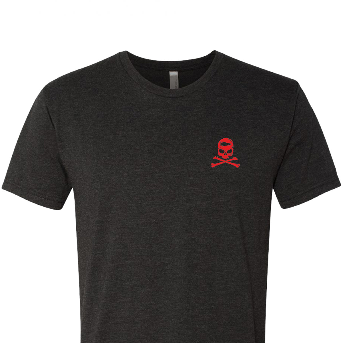 The GORUCK Know Thyself Tribe Tee - Tri-Blend is a dark gray shirt featuring a small red skull and crossbones on the upper left chest, ideal for those taking part in a GORUCK Challenge.