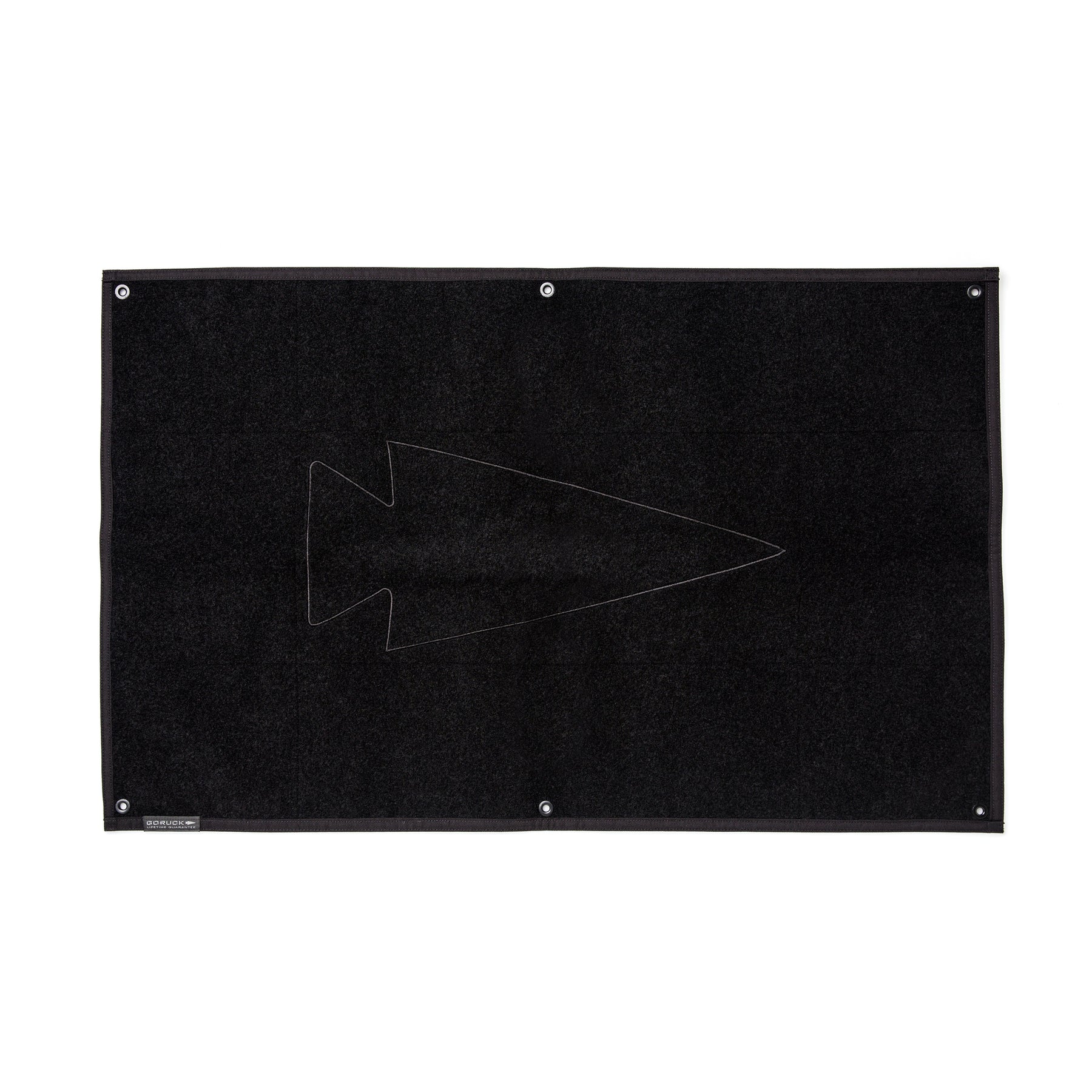 The black rectangular rug showcases a simple arrowhead design at its center, similar to the GORUCK Spearhead Patch Board, and is made with the robust 1000D Cordura material.