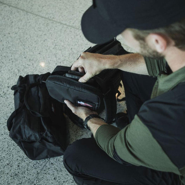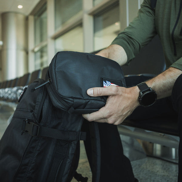 In an airport terminal, a traveler sits holding a sleek black travel bag adorned with a distinctive American flag patch. They are dressed in a green shirt and wear a black smartwatch that perfectly complements their GORUCK GR1 Field Pocket - Dyneema electronics organizer tucked inside.