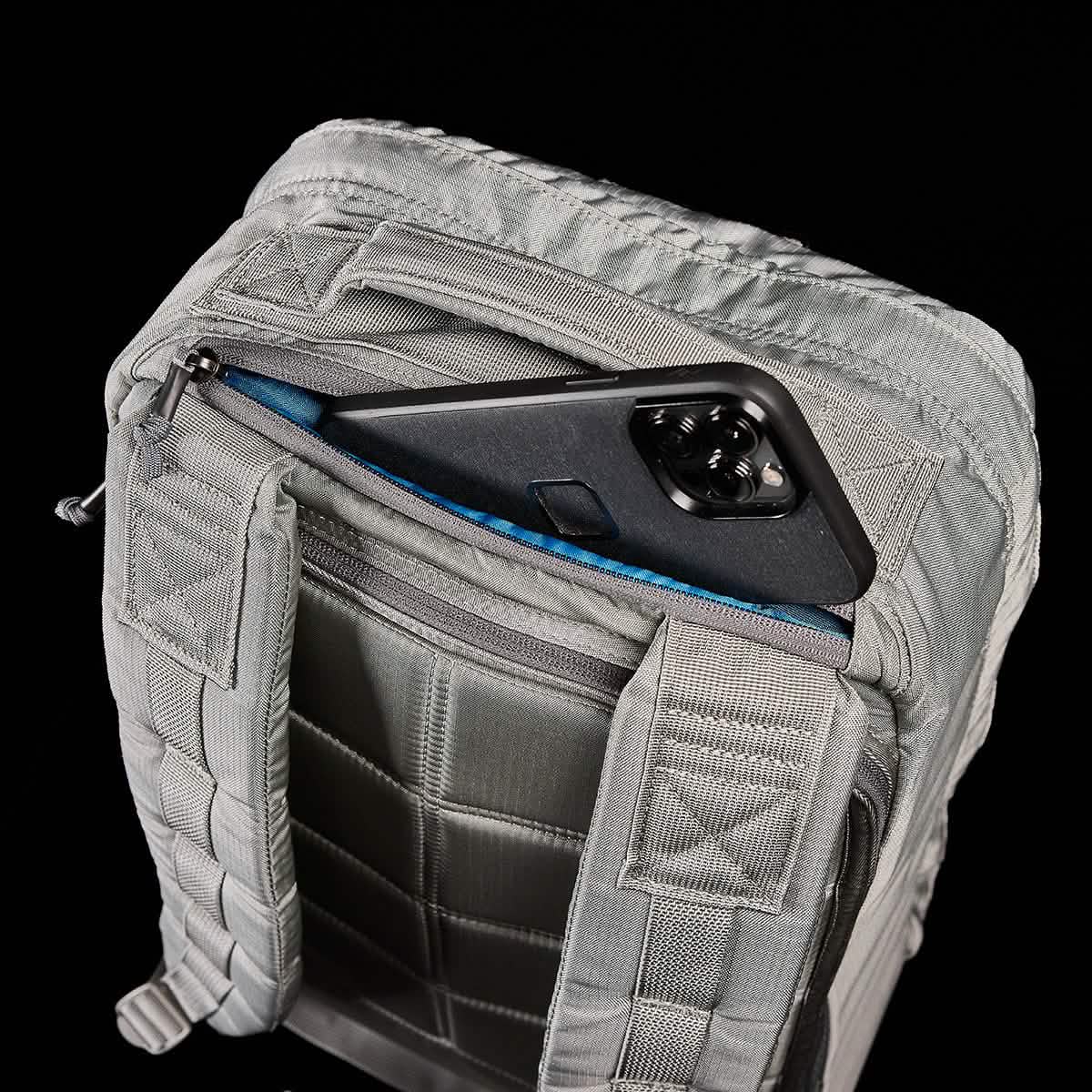 A GR1 USA - Ripstop ROBIC® rucksack by GORUCK in gray, showcasing its ultra-lightweight design with padded straps and a quilted back panel, is partially open to reveal a black smartphone nestled inside a pocket. The solid black background brings out the details of the rucksack.