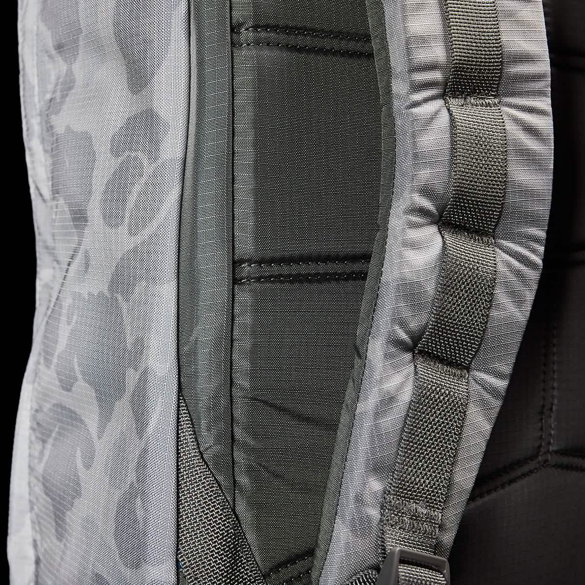 Close-up of the GORUCK GR1 USA - Ripstop ROBIC® backpack featuring a camouflage pattern. The image highlights its padded straps and detailed stitching, showcasing the texture and design of its ultra-lightweight fabric. The colors predominantly include shades of gray and green.