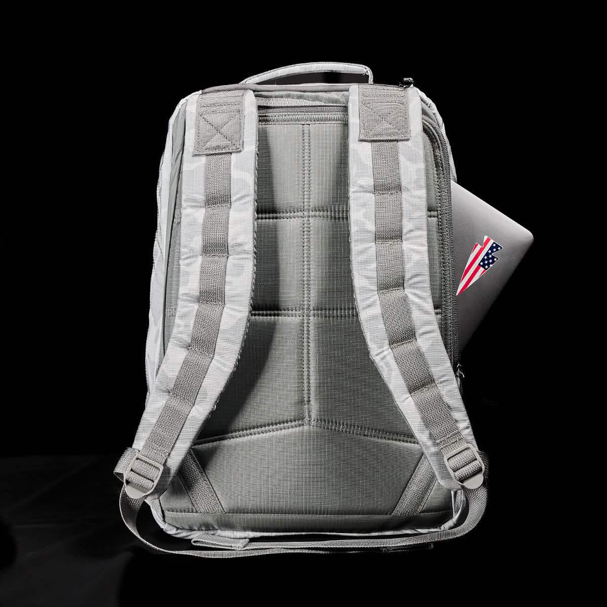 A gray GR1 USA - Ripstop ROBIC® backpack from GORUCK stands upright, showcasing its water-resistant design and padded straps, with a laptop partially visible in the side pocket adorned with an American flag sticker. The black background highlights the rucksack's sleek design.