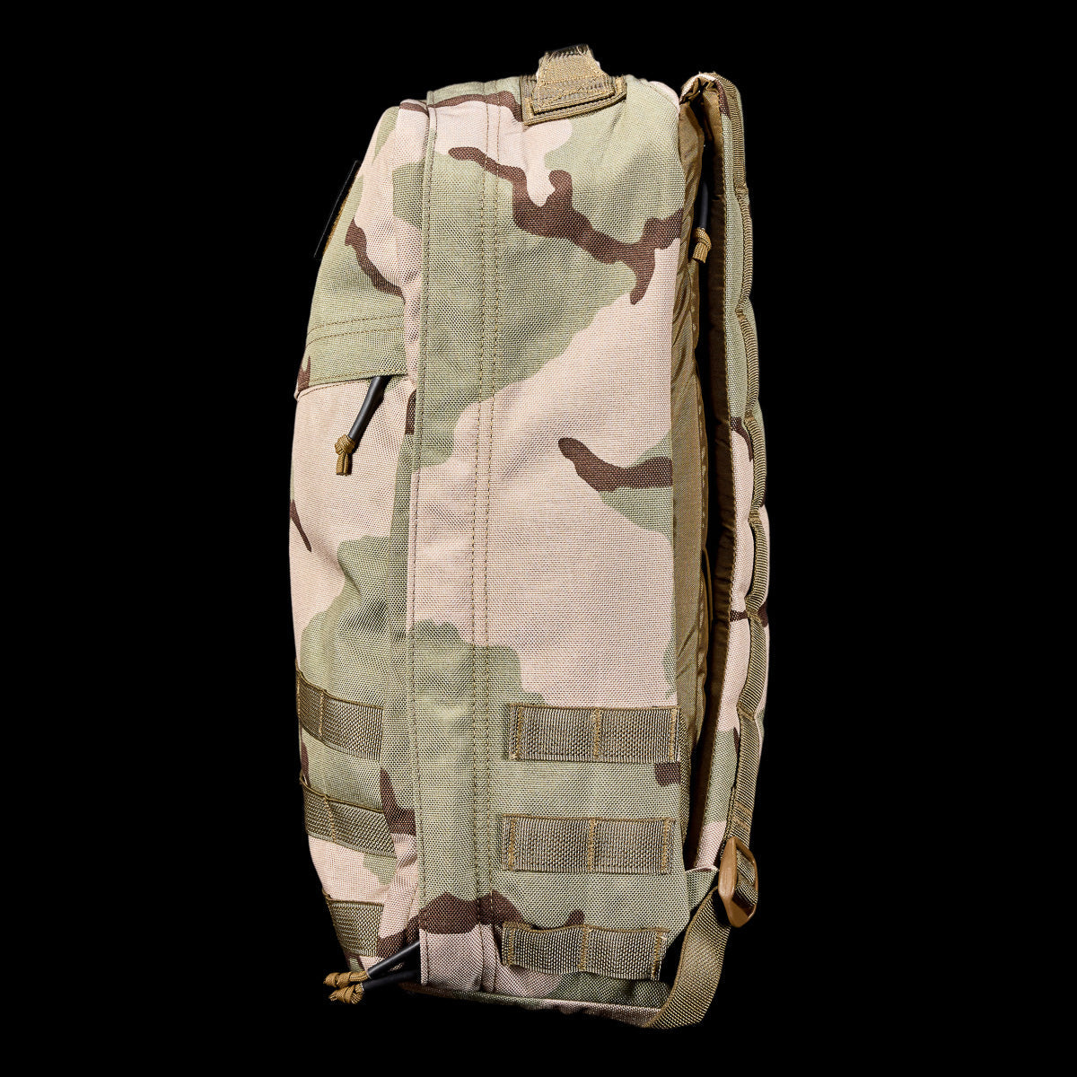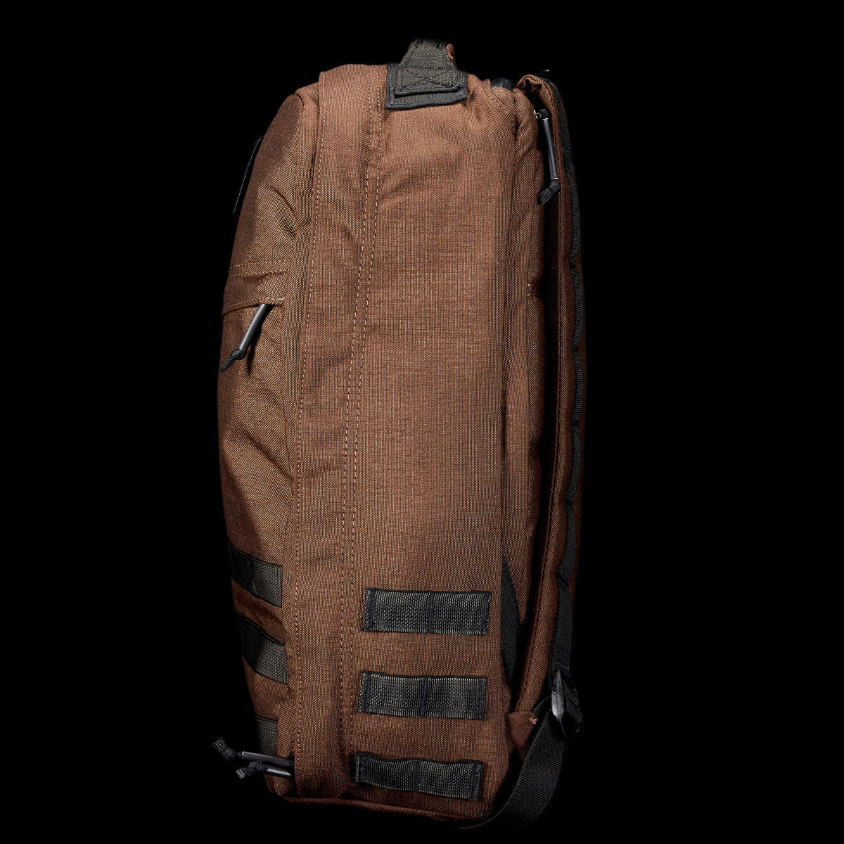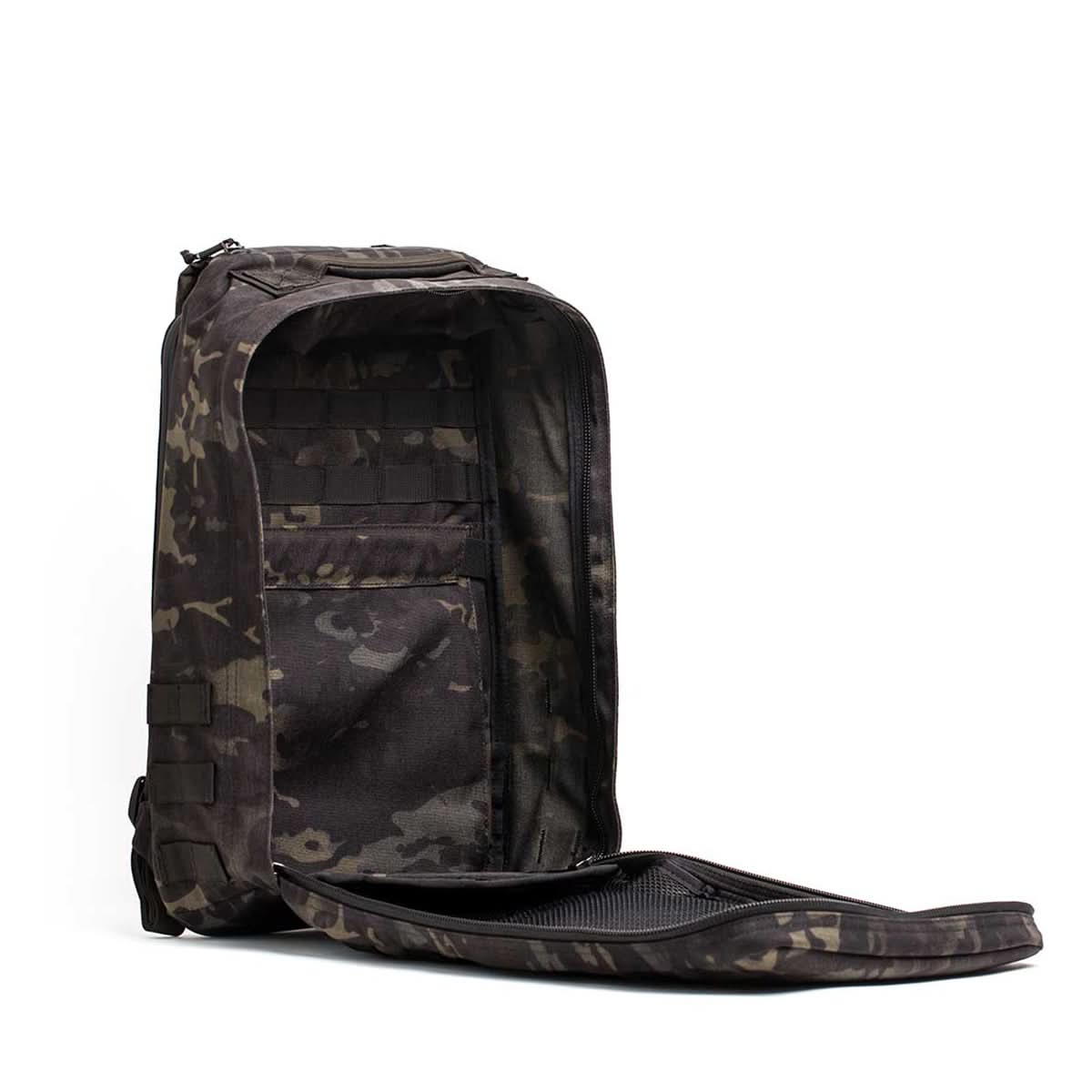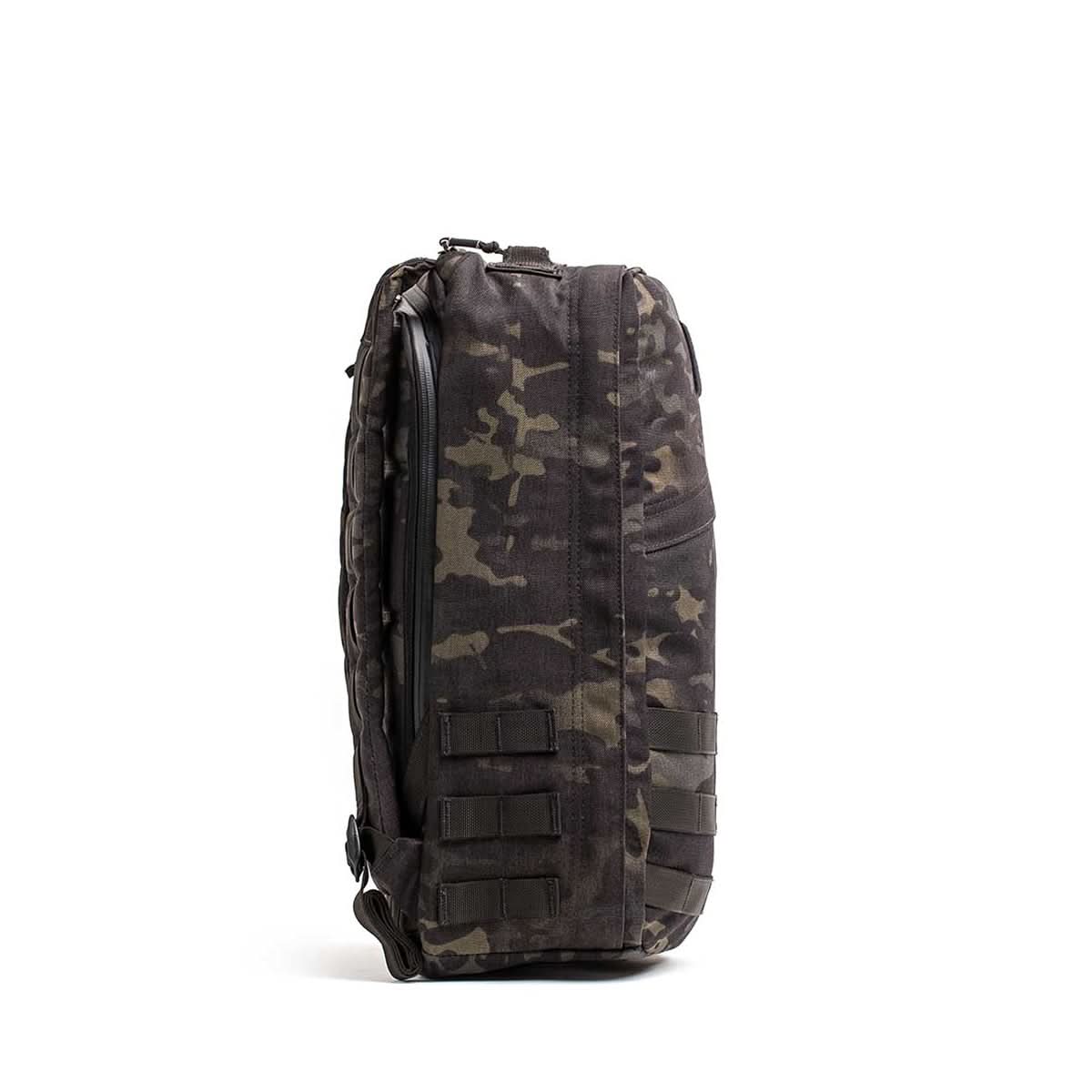 Side view of the GR1 USA - Cordura in black camouflage, crafted with Special Forces-grade materials. It features a zipper and extra strap loops, ideal for tackling the GORUCK Challenge.