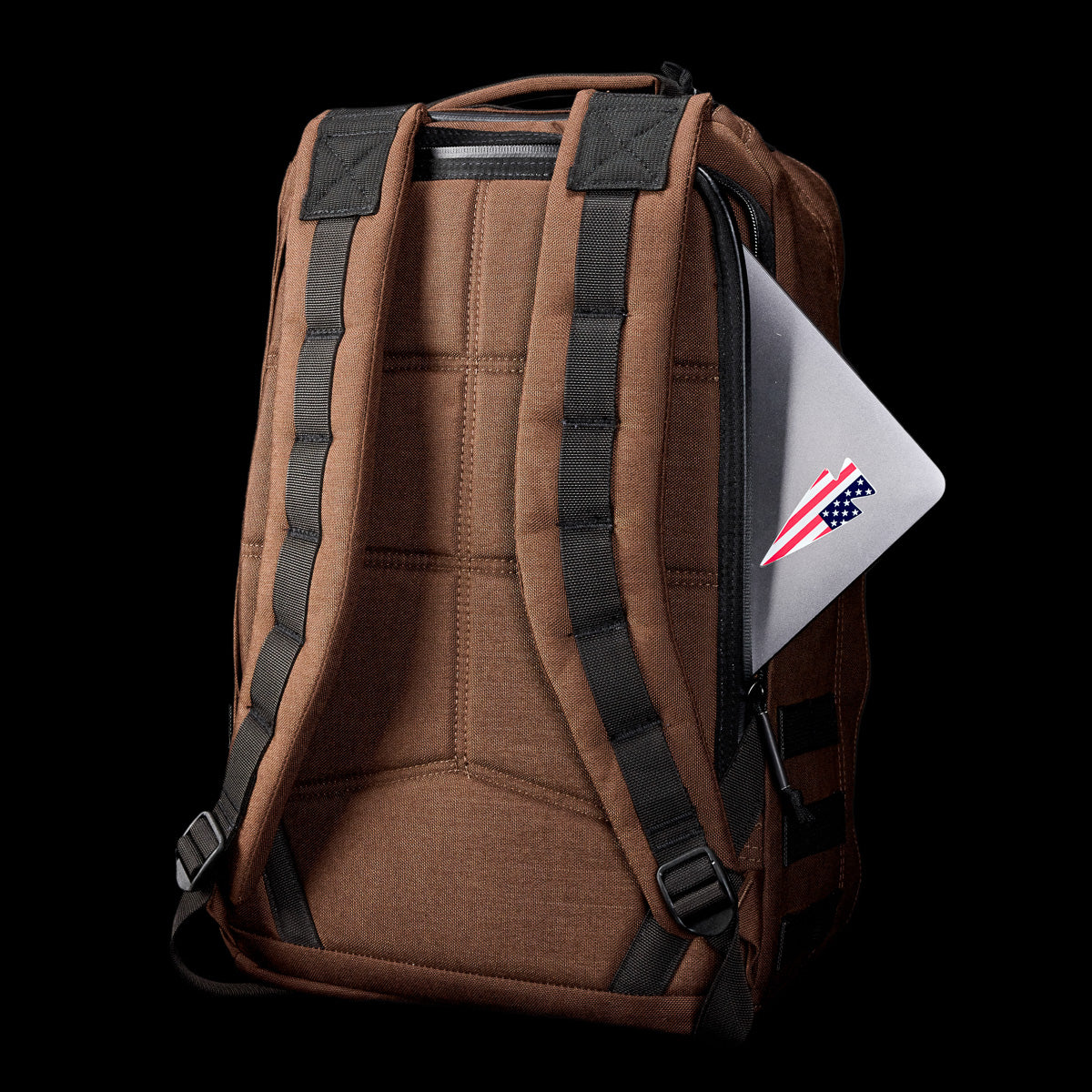 A person carefully places a laptop adorned with an American Manufacturing flag sticker into the sleek GR1 USA - Cordura backpack by GORUCK, ready for a mission that seems almost Special Forces worthy.