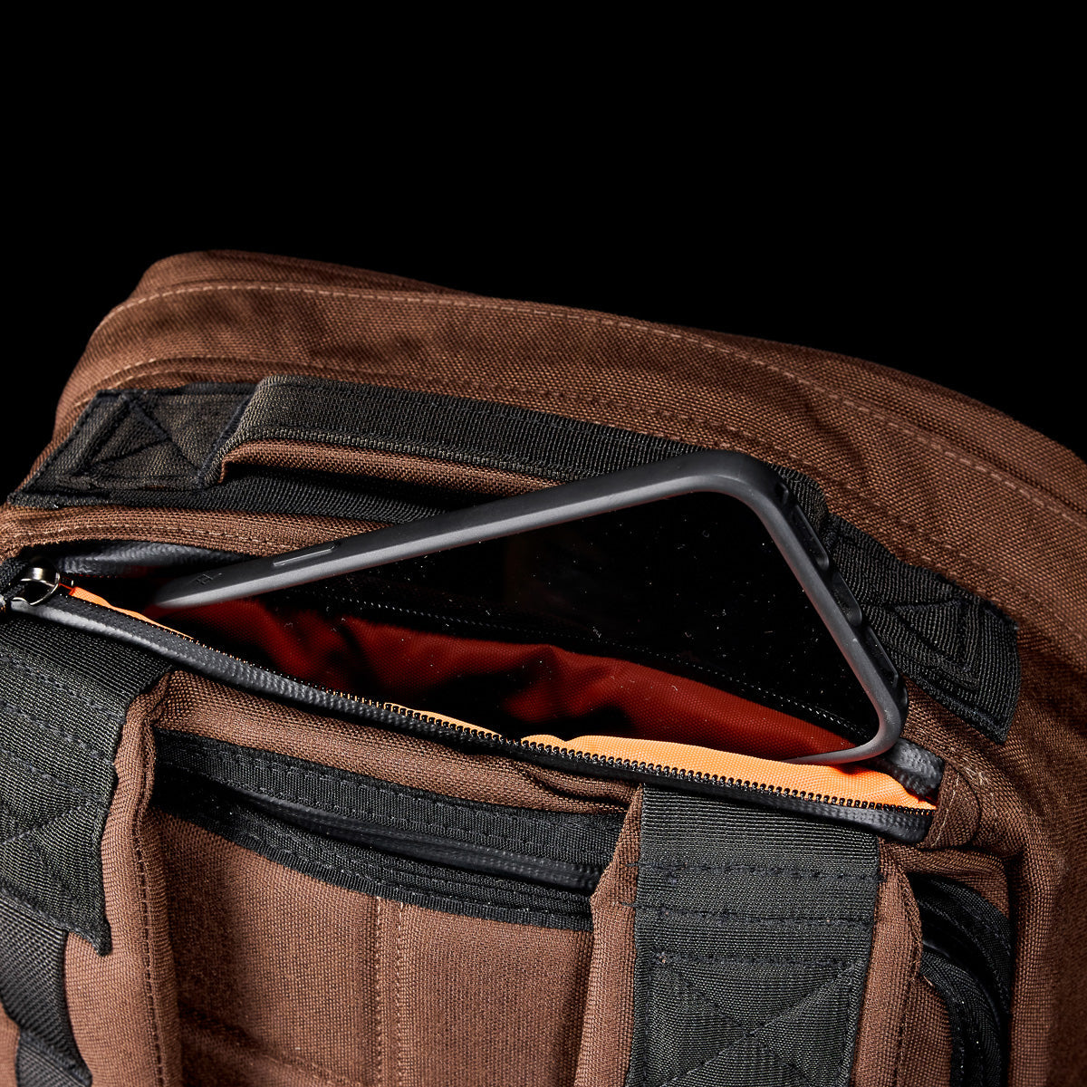 A smartphone peeks from the top pocket of a dark-colored backpack with padded straps, highlighting its GR1 USA - Cordura design by GORUCK and bombproof laptop compartment, set against a black background.