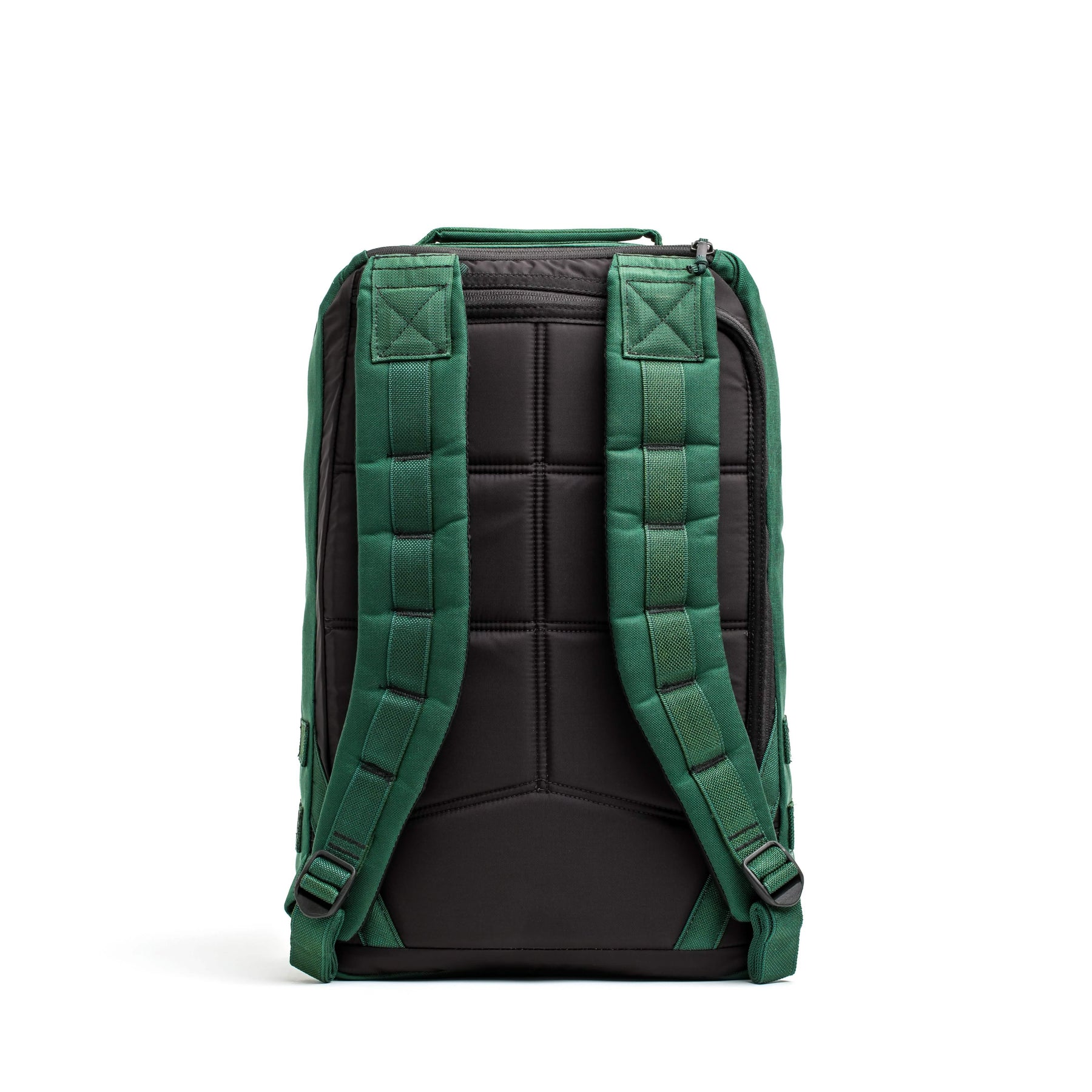 Rear perspective of a black and green GR1 USA - Cordura backpack, featuring padded, adjustable shoulder straps, specifically crafted to endure the challenges of a GORUCK event.