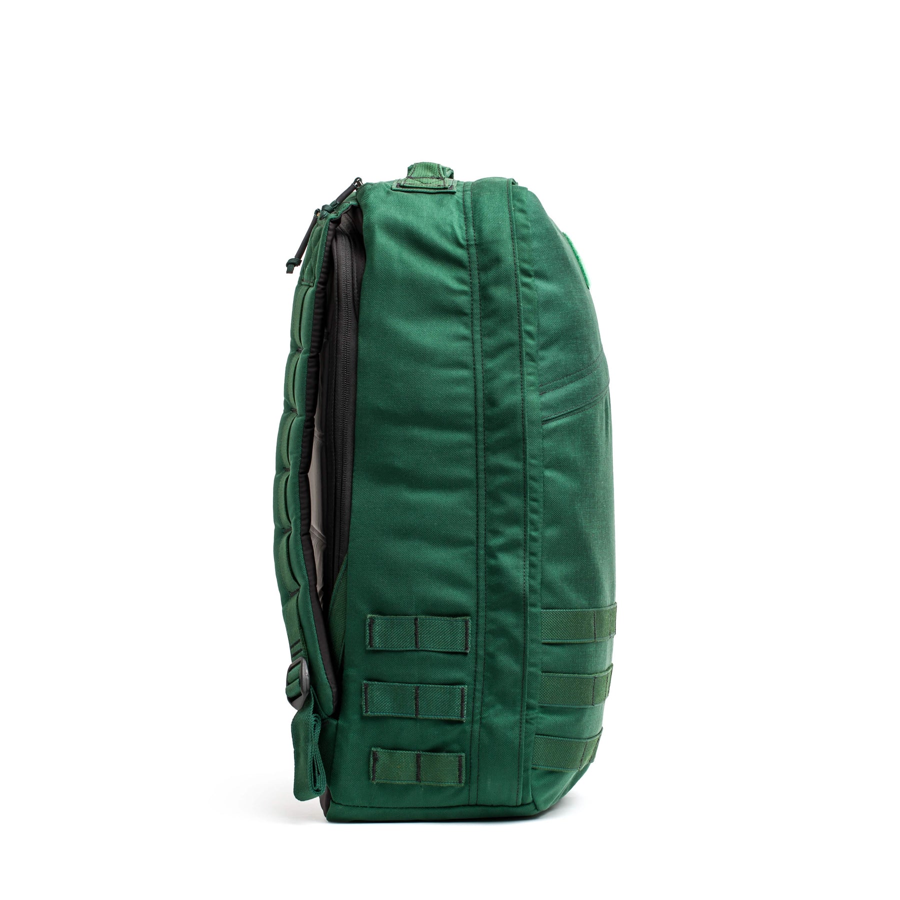 Side view of a green tactical backpack, similar to the GORUCK GR1 USA - Cordura (The Original Ruck), featuring multiple compartments and straps on a white background.