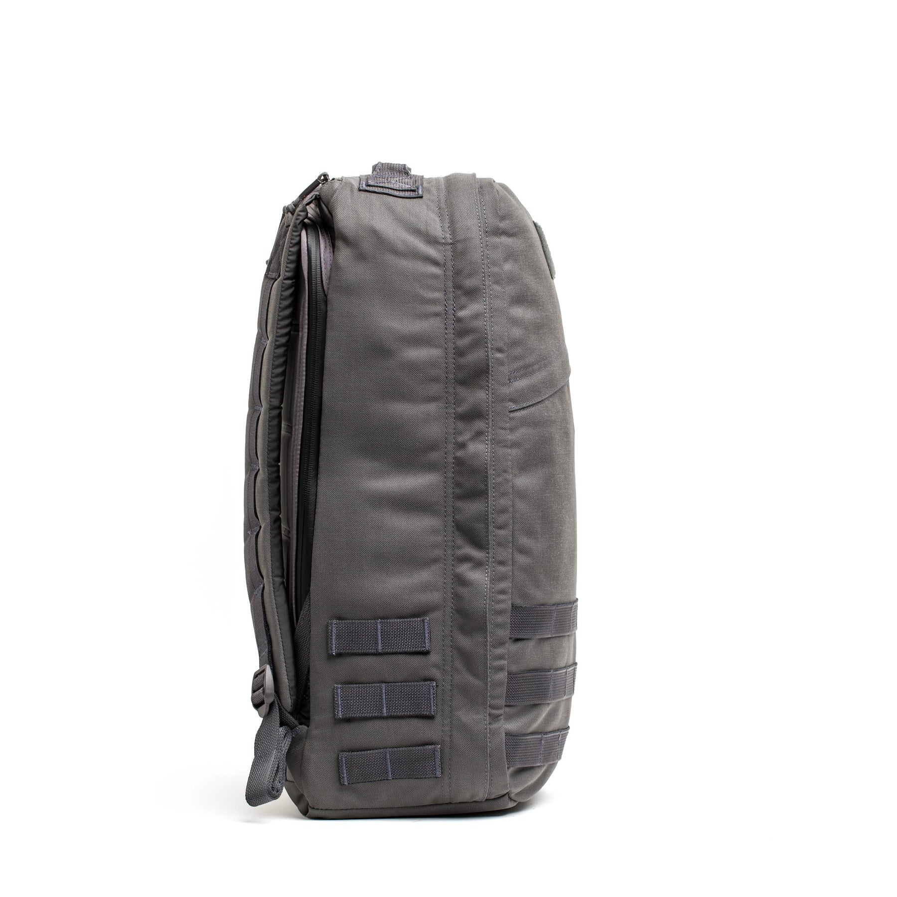 Side view of a dark gray GORUCK GR1 USA - Cordura backpack with padded straps, inspired by Special Forces requirements. It includes multiple compartments and black attachment loops on the side, standing upright against a plain white background.