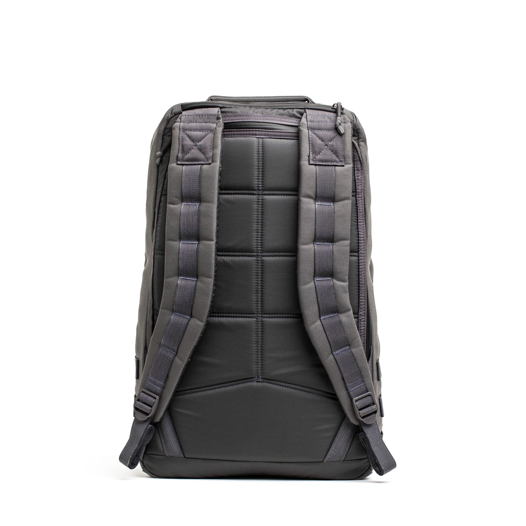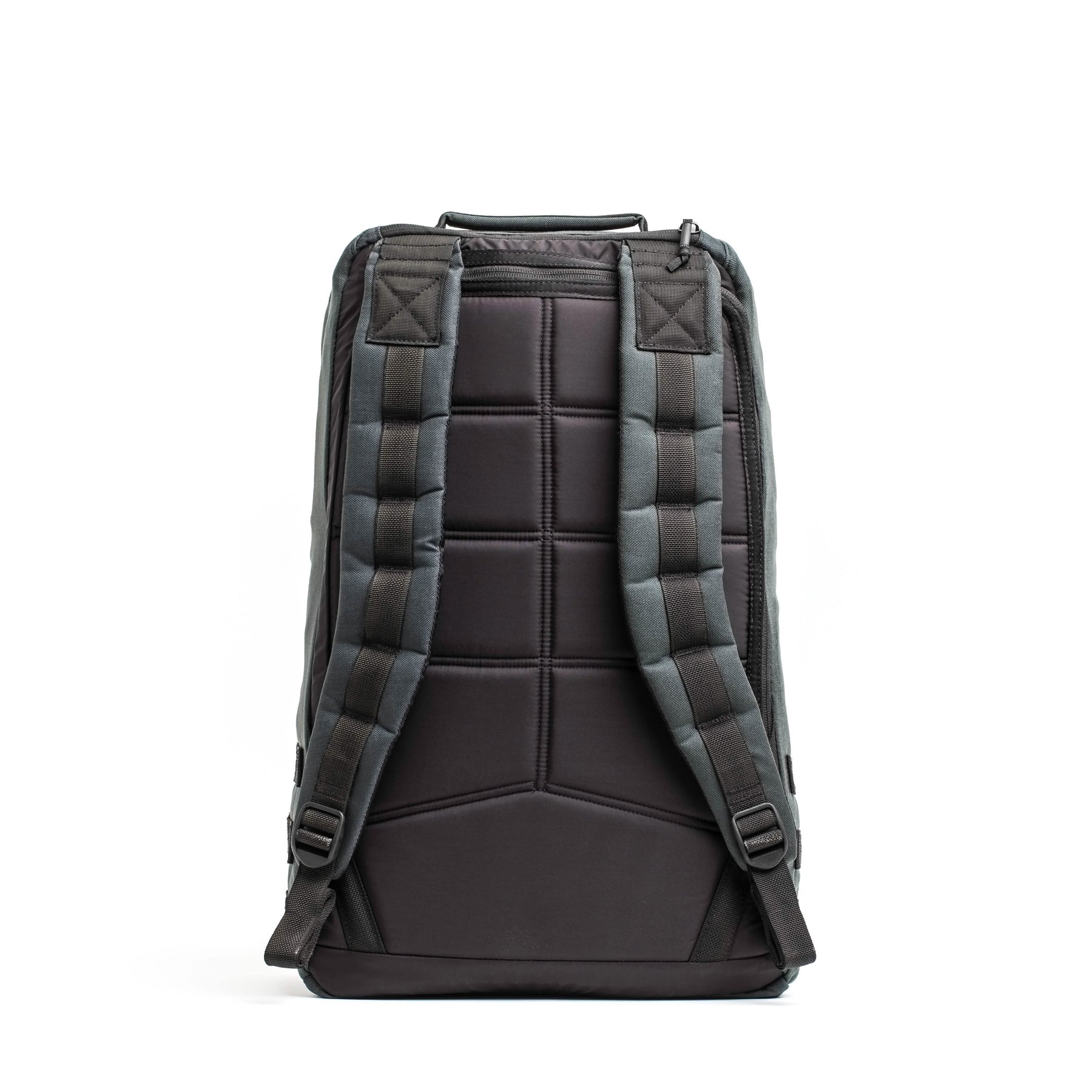 The reverse side of a GORUCK GR1 USA - Cordura backpack in gray and black, featuring padded straps and a quilted texture, highlights the robust rucksack design against a white backdrop.