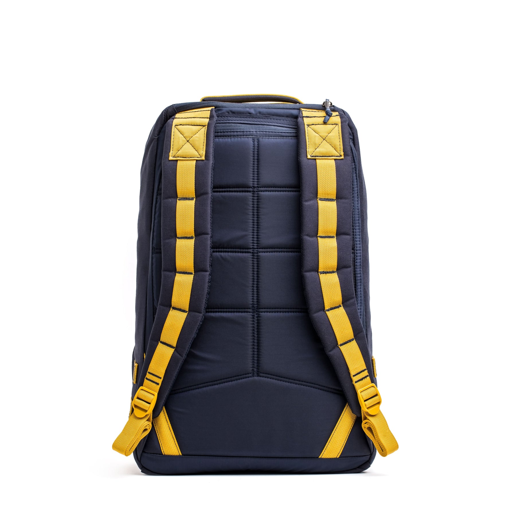 A GORUCK GR1 USA - Cordura (The Original Ruck) in navy blue with yellow straps, showcasing a Special Forces grade design and a bombproof laptop compartment, depicted from the back on a white background.