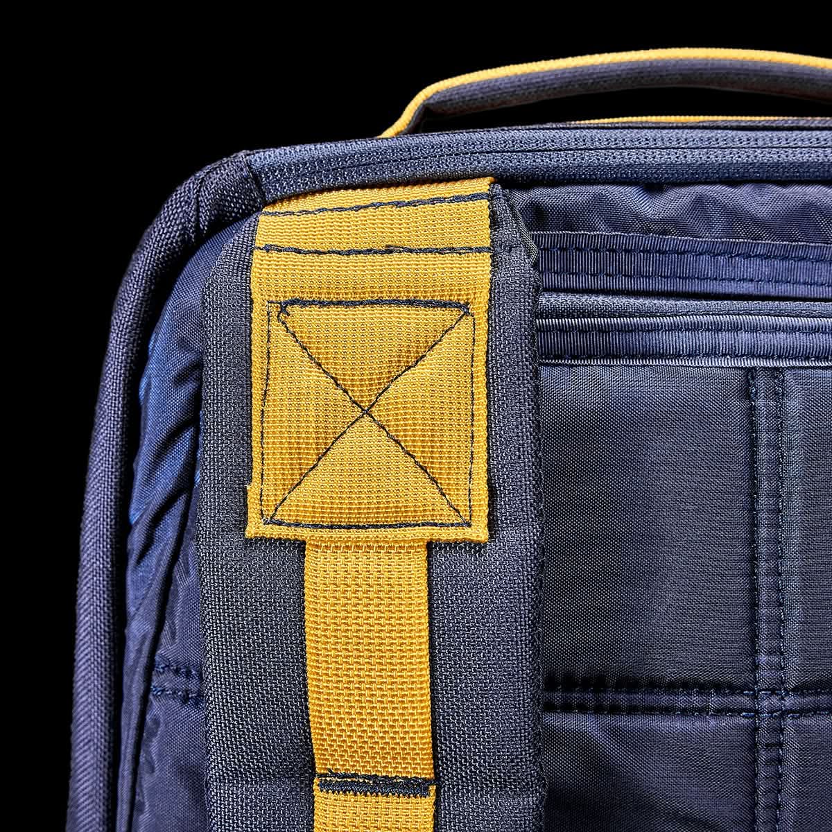 Close-up of a blue and yellow GORUCK GR1 USA - Cordura (The Original Ruck) backpack showcasing detailed stitching and texture set against a black background, highlighting its bombproof laptop compartment.