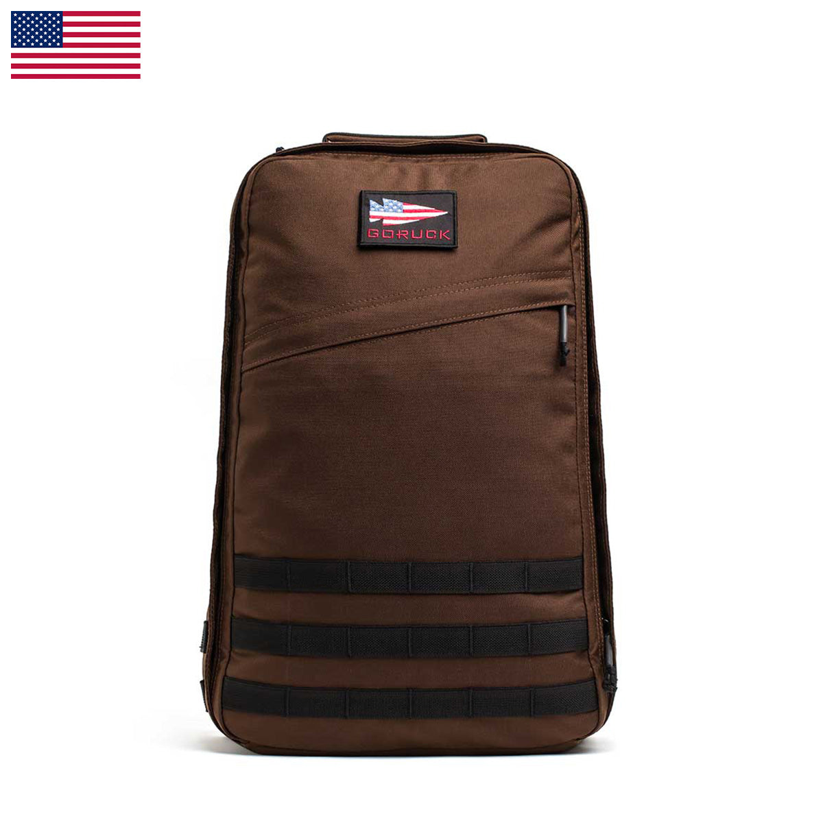 The GR1 USA - Cordura backpack, made with Special Forces-grade materials, features webbing and velcro patches. Displayed against a white background with a small US flag, it’s ideal for your next GORUCK Challenge.
