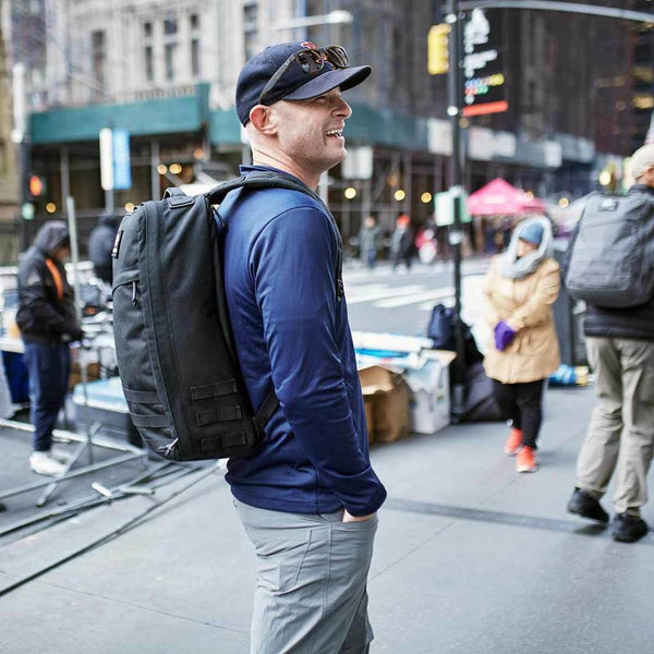 Man with a gray GR1 USA - Cordura (The Original Ruck) by GORUCK over one shoulder, featuring a bombproof laptop compartment, against a black background.