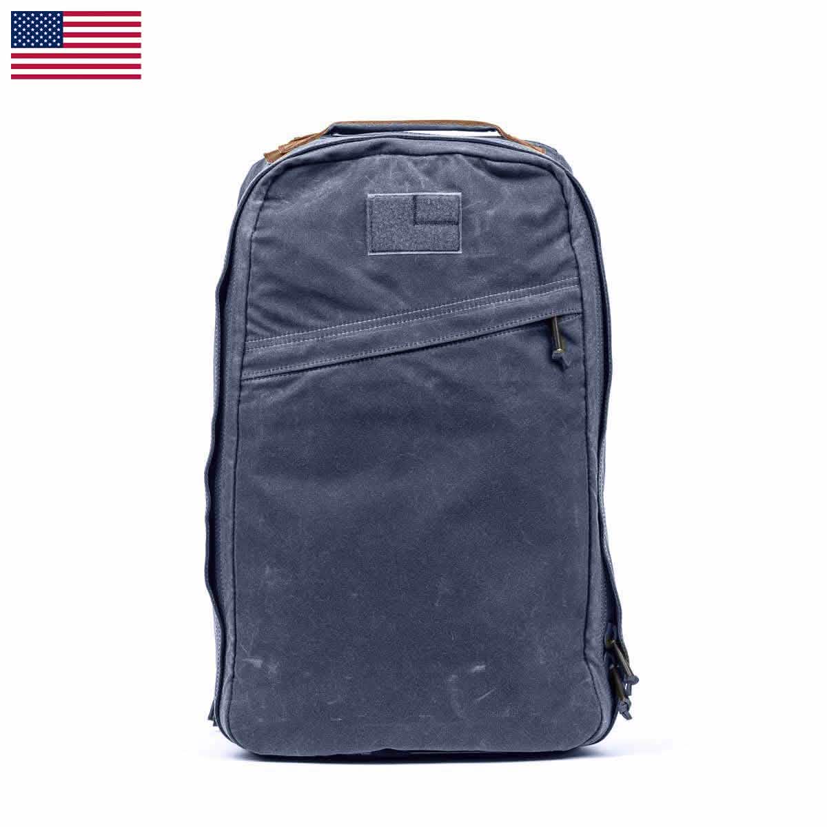 The GR1 USA - Heritage is a blue backpack with padded straps, brown accents, and a grid back panel on white. Made from durable waxed duck canvas, it includes a bombproof laptop compartment to keep your tech safe on every adventure.