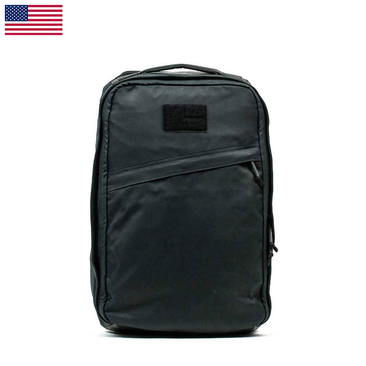 The GORUCK GR1 USA - Heritage rucksack, featuring a dark gray color with a front pocket and a small brown patch, is showcased against a plain white backdrop that highlights its minimalist design. An American flag adorns the top left corner, and it is expertly crafted from durable waxed canvas, making it both stylish and functional.