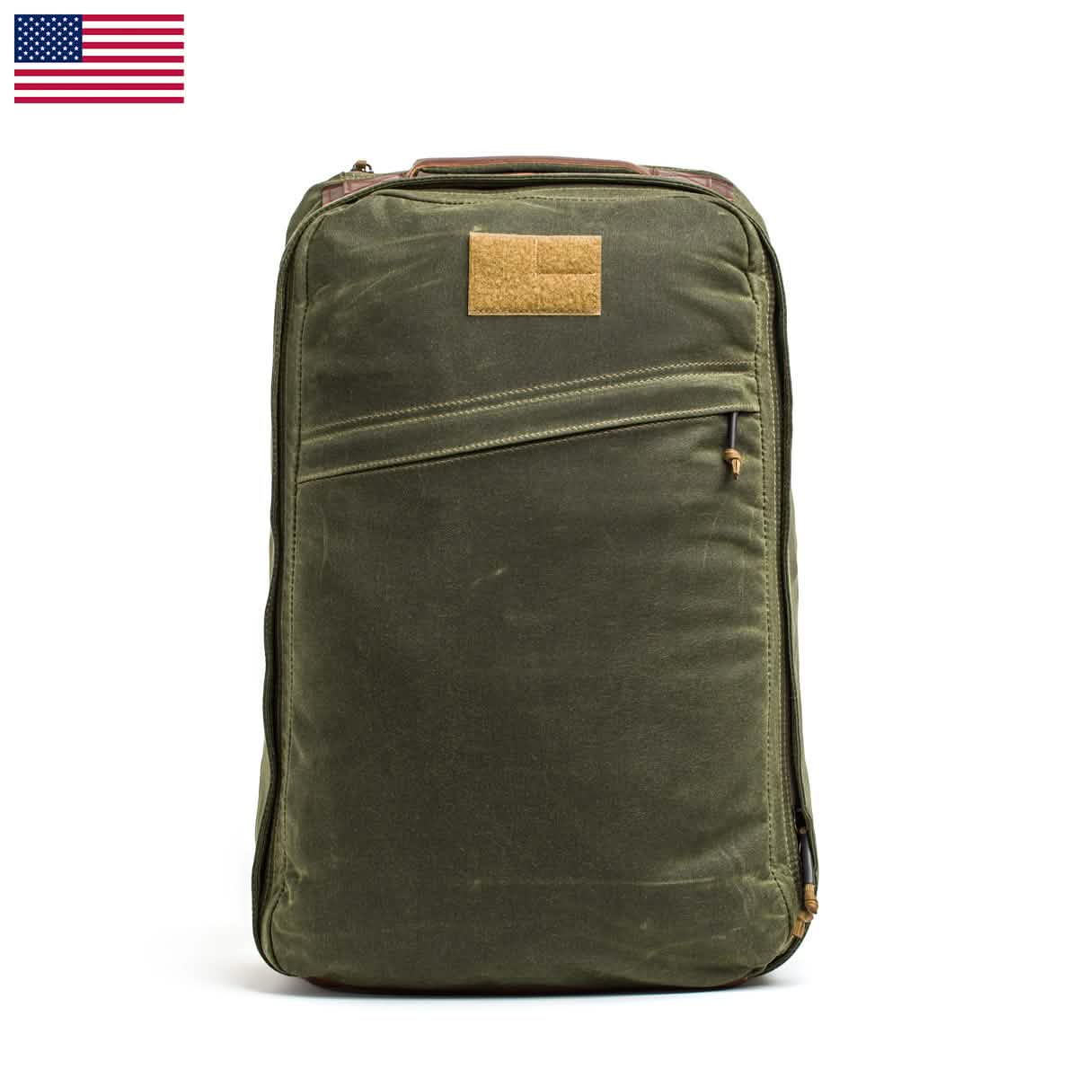 The GR1 USA - Heritage Waxed Canvas is a durable backpack made from waxed duck canvas, featuring a tan patch and a small American flag in the top left corner.