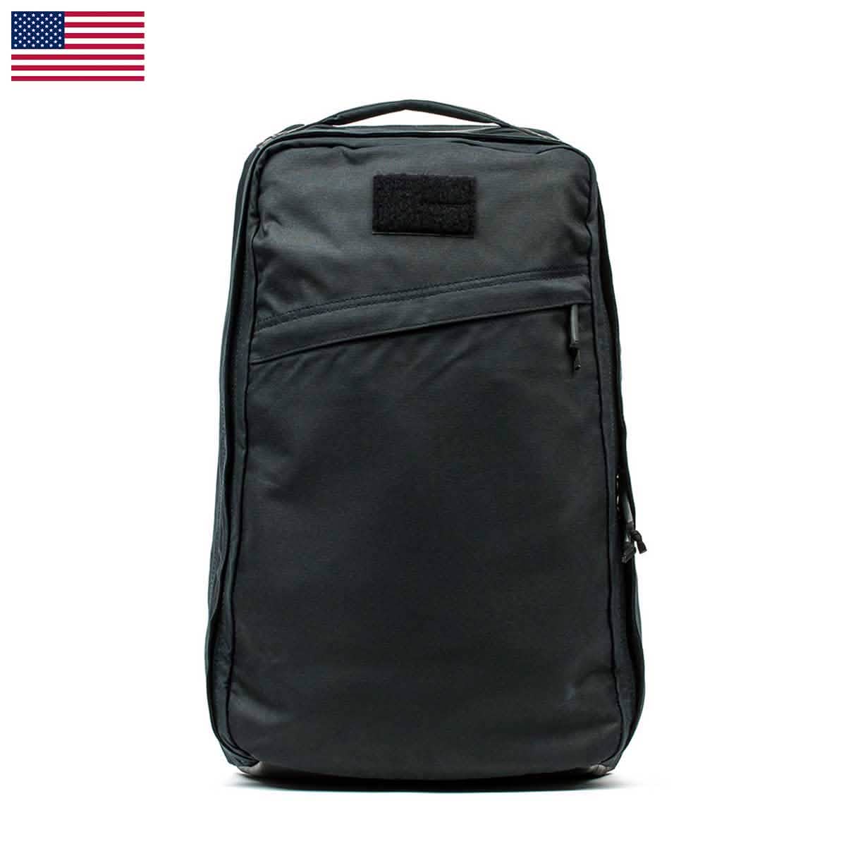 The GR1 USA - Heritage by GORUCK is a black rucksack made from waxed duck canvas with a fully opening main compartment secured by a zipper. Inside, it features multiple organizing sleeves and mesh pockets for efficient storage and easy access, all enhanced by a robust Martexin Wax finish.