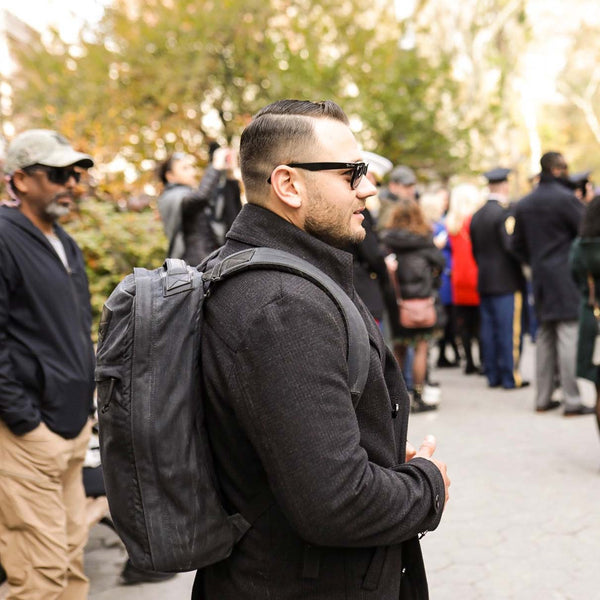 A person wearing sunglasses and a black jacket carries the GR1 USA - Heritage rucksack by GORUCK, crafted from waxed duck canvas with a Martexin Wax finish. The background is a plain light color.