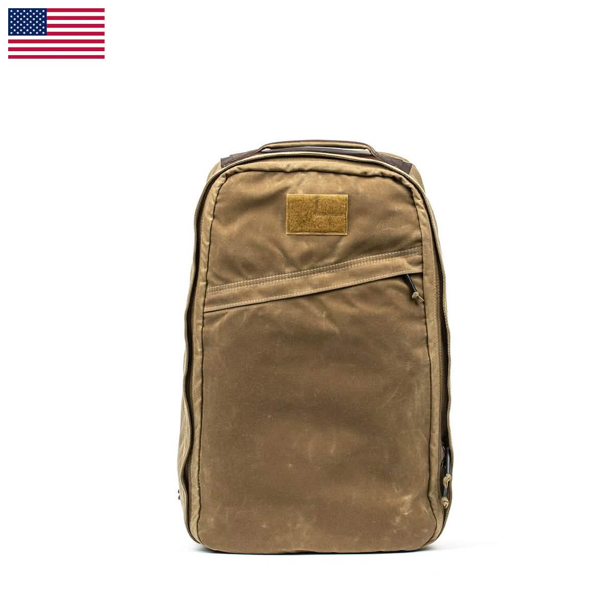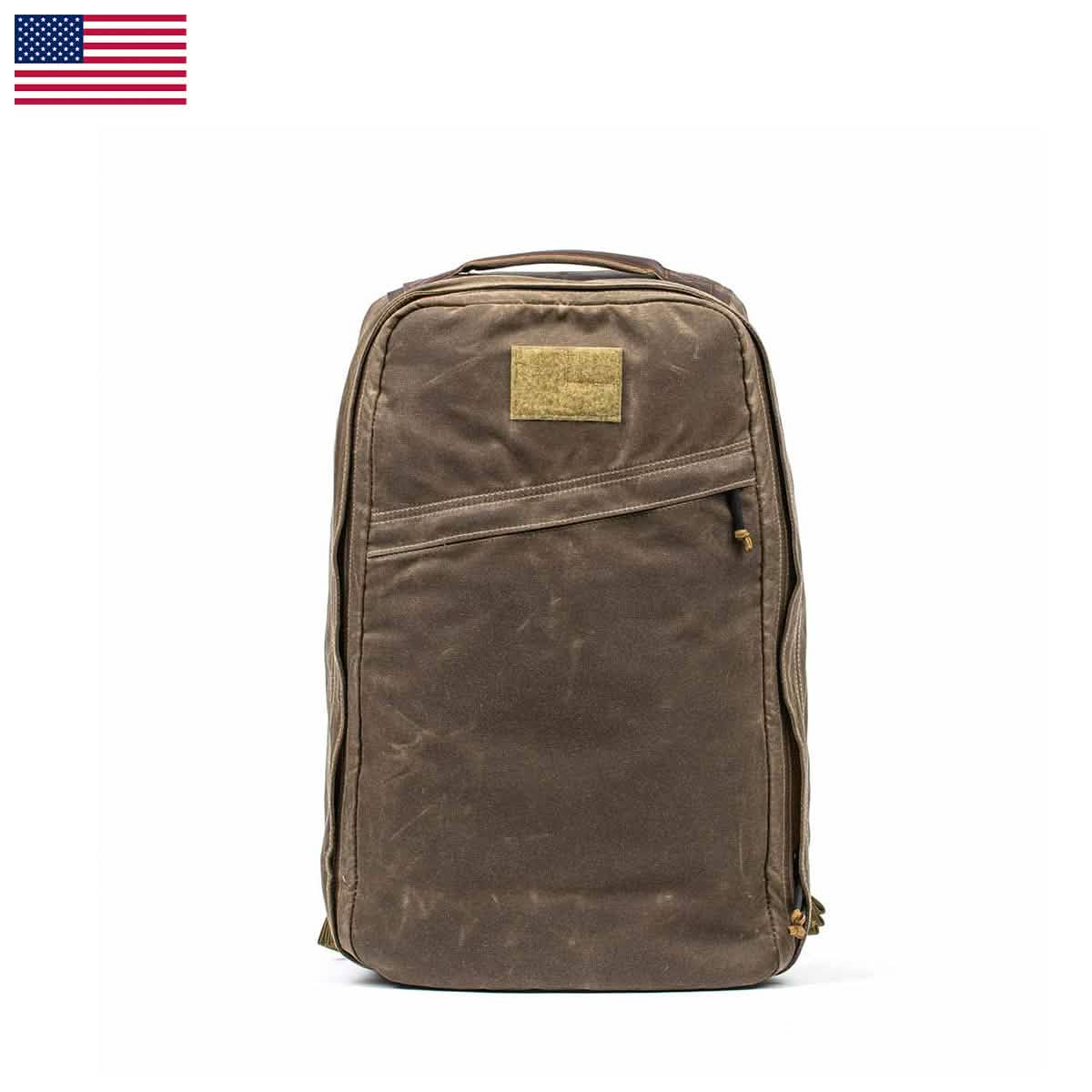 The GR1 USA - Heritage backpack by GORUCK is expertly crafted from waxed duck canvas, offering a rugged and sturdy appearance. It features a front zip pocket and a small patch, with weathered fabric detailing. An American flag is displayed in the top left corner, enhancing its design.