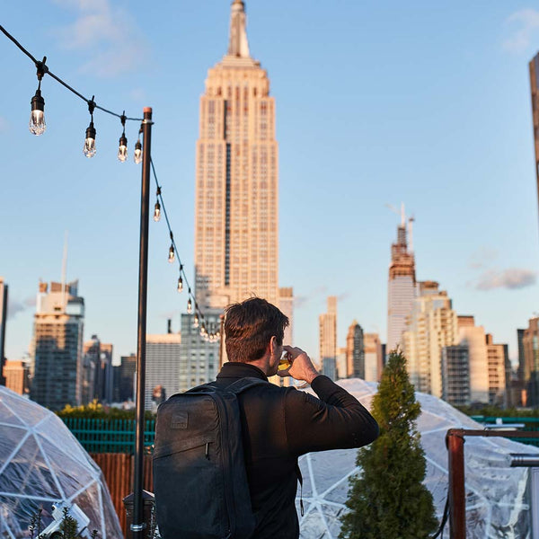 A person sitting on a couch outdoors, holding a glass of beer in one hand and resting the other on a GR1 USA - Heritage rucksack by GORUCK placed on the ground. The person is wearing dark clothing, creating a relaxed atmosphere.