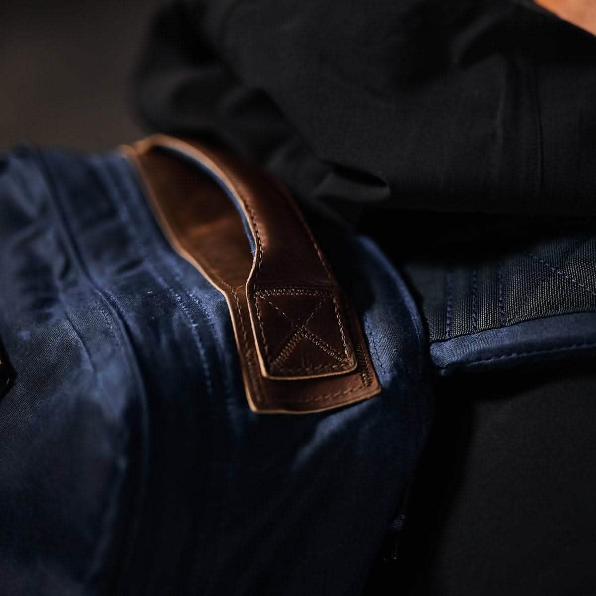 Close-up of a person wearing a dark blue GR1 USA - Heritage rucksack by GORUCK with a brown Red Wing Leather handle on their shoulder. The bag and handle are contrasted against a black jacket, highlighting the textures and materials.