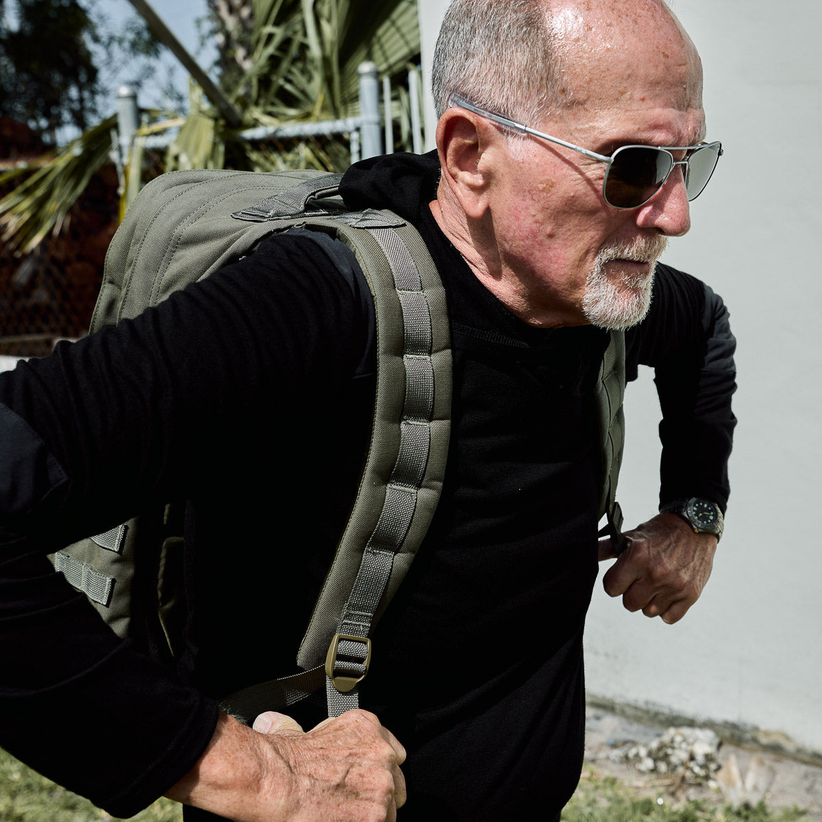 An older man in black attire and sunglasses walks outdoors by a white wall with the GR2 USA - Cordura travel backpack slung over his shoulder.