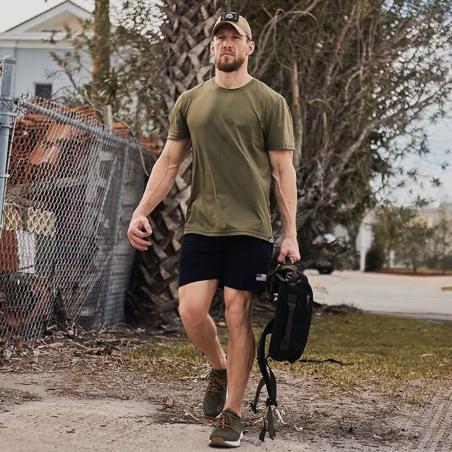 A man wearing a khaki t-shirt, black shorts, and a baseball cap swiftly navigates the dirt path with dynamic movements. He carries a GORUCK backpack in one hand, showcasing the High Speed, Low Drag Training Program as trees and a chain-link fence frame the background.
