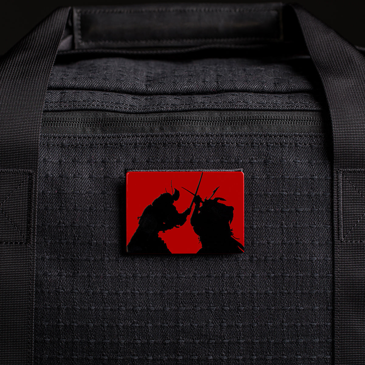 Rectangular pin with two samurai dueling on red, attached to the black Kit Bag x Carryology - GRXC2 Samurai 2.0, crafted from custom technical fabric.