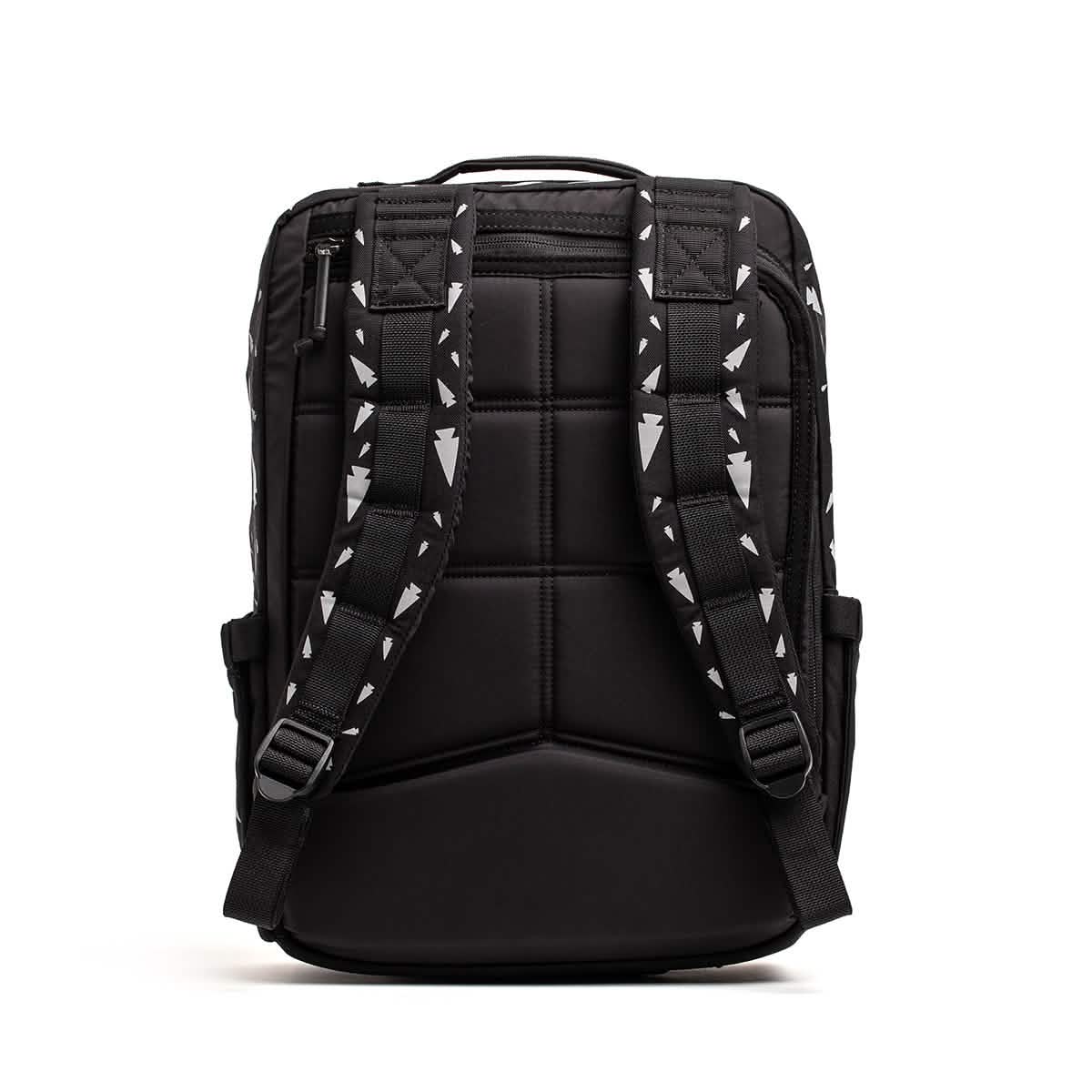 Introducing the KR1 - Spearhead Splatter from GORUCK, a sleek and modern black kids' rucksack. It features padded shoulder straps and displays a geometric white arrow pattern. This book bag comes with a quilted back panel for added comfort and has several visible side straps for easy adjustments, making it perfect for carrying school supplies.