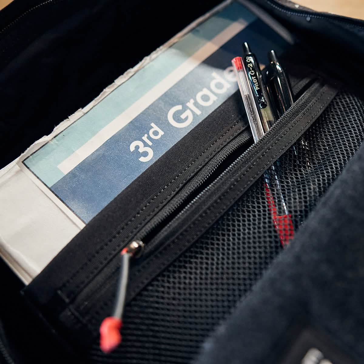 A GORUCK KR1 - Spearhead Splatter kids rucksack reveals a folder labeled 3rd Grade and several pens neatly tucked in a mesh pocket, brimming with essential school supplies.
