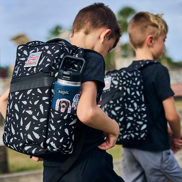 Two children equipped with GORUCK's KR1 - Spearhead Splatter book bags, featuring black and white geometric patterns, walk outdoors on a sunny day. One of them is carrying a water bottle. They are surrounded by trees and grass, with a sidewalk visible in the background.