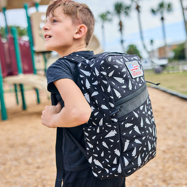 Back view of the KR1 - Spearhead Splatter book bag by GORUCK, featuring adjustable straps and a white arrow pattern. This kids' rucksack includes padded back support for comfort and a plain black lower section for style, making it perfect for carrying school supplies in style.
