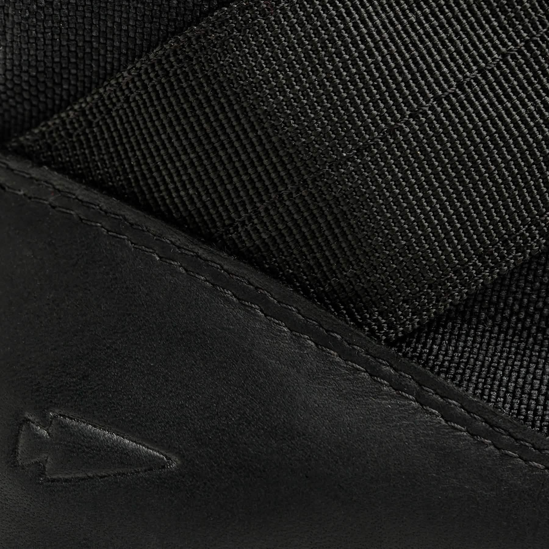 Close-up of black fabric and leather featuring a stitched arrow-shaped logo, highlighting the texture and material details, reminiscent of the rugged design characteristic of GORUCK's MACV-2 - Mid Top - Black.