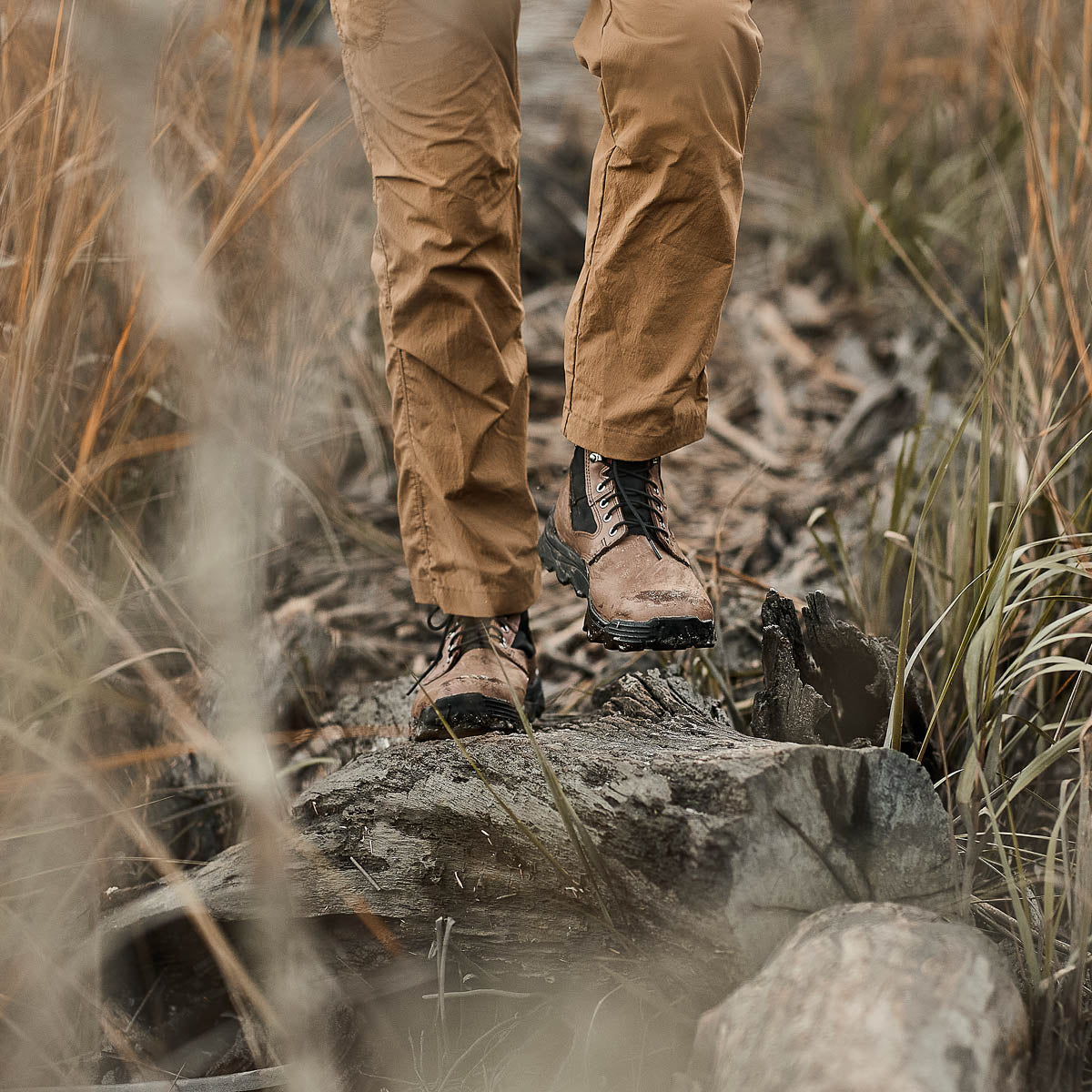 Someone wearing the MACV-2 - Mid Top in Chestnut + Black, featuring an aggressive triple compound outsole, pairs them with khaki pants while strolling along a wooded path bordered by tall grass.