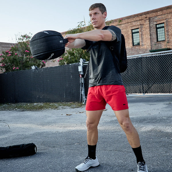 A man in a Men’s Performance Tee - ToughMesh by GORUCK, featuring a bold red color, sunglasses, and black shorts stands in front of a chain-link fence. The sun casts shadows on the ground behind him, highlighting the shirt's quick-drying performance and featherweight design.