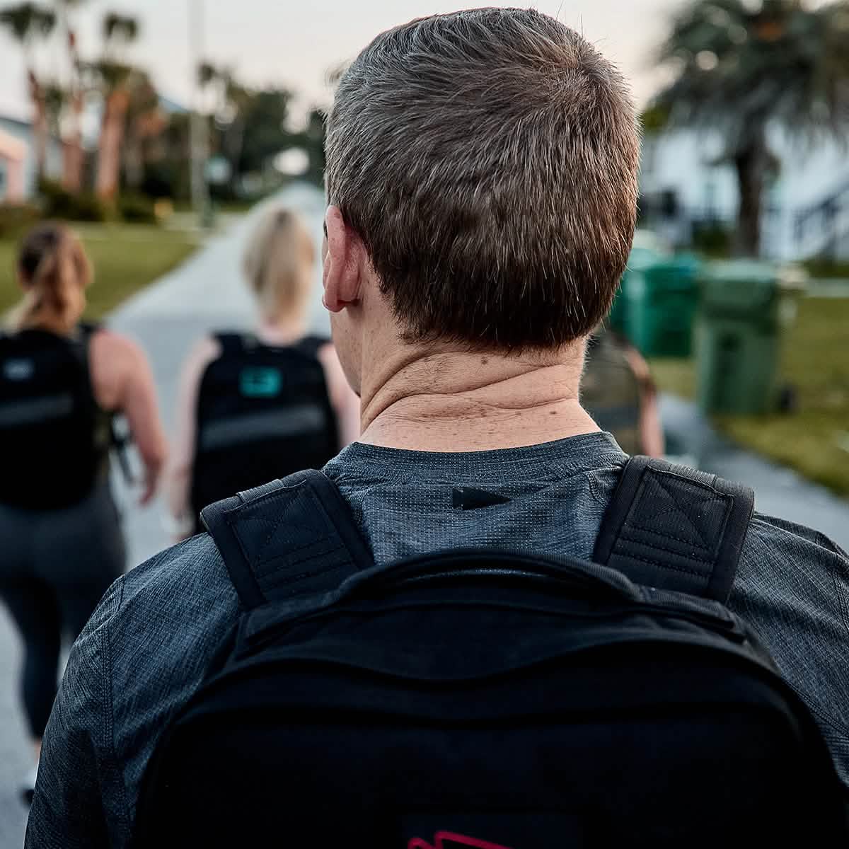 A group of people, viewed from behind, are walking up a paved road in a suburban setting with trees and houses along the street. They are dressed in casual attire, featuring backpacks and GORUCK's Men’s Performance Tee - ToughMesh, which is ideal for leisurely suburban strolls.