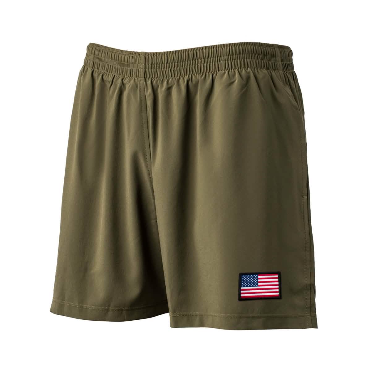 The Men’s USA Training Shorts by GORUCK, crafted with ToughStretch fabric for optimal movement, are olive green athletic shorts featuring an elastic waistband and a small American flag patch on the lower left side. Designed for function and durability, these shorts provide effortless comfort.