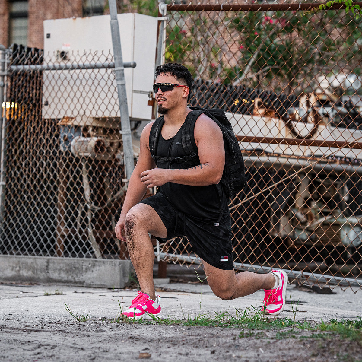Man wearing black attire and bright pink sneakers lunges outdoors by a chain-link fence, showcasing Men’s USA Training Shorts - ToughStretch for durability and flexibility.