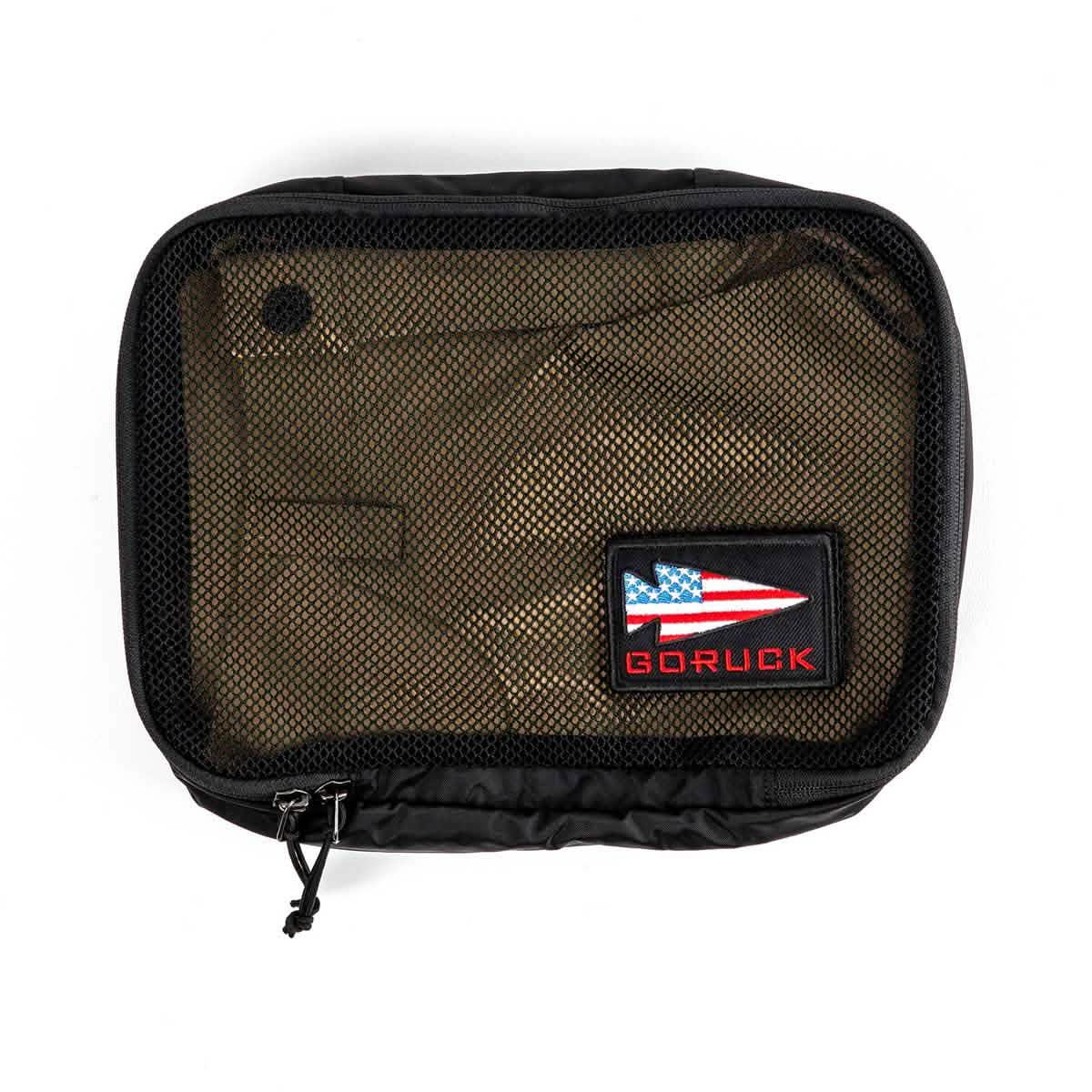 A GORUCK Packing Cube in black, made from ultra-light nylon and featuring a mesh cover, is partially unzipped to show its inner compartment. It proudly displays an American flag patch and the GORUCK logo in the bottom right corner, making it a perfect travel companion.