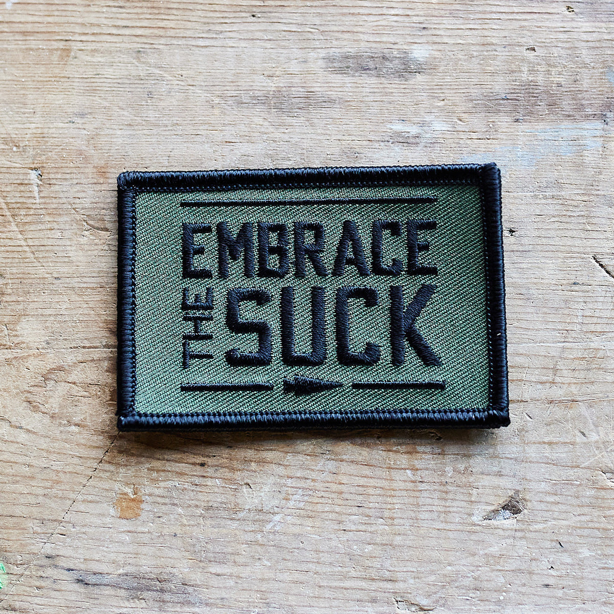 An embroidered patch from vendor-unknown, titled "Patch - Embrace The Suck," is secured with VELCRO® backing and showcases the phrase "Embrace the Suck" prominently in bold black letters, encircled by a striking black border.