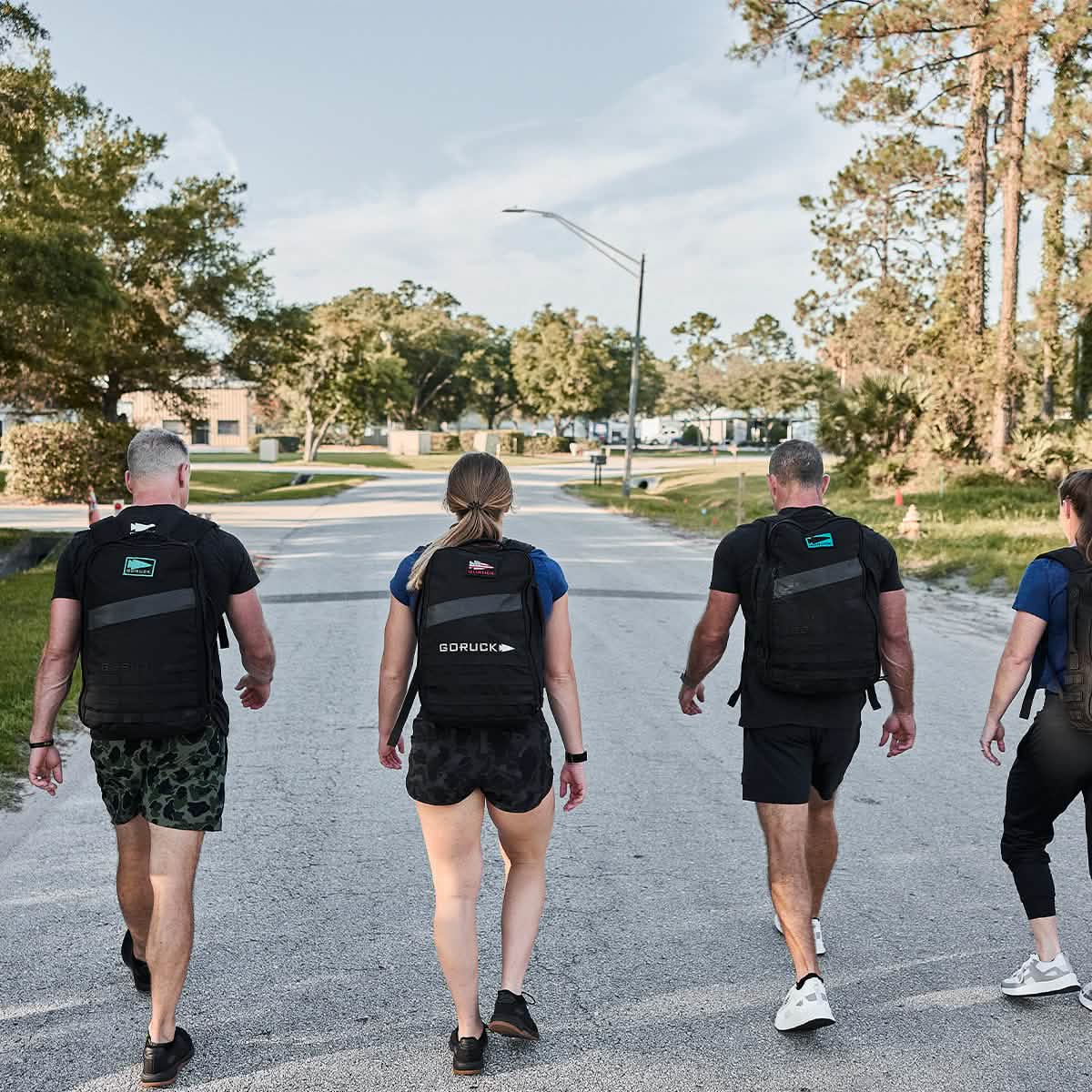 Four individuals stroll down a suburban street, each wearing backpacks adorned with the GORUCK Spearhead Patch. They are dressed in athletic wear and appear to be participating in a fitness activity. Trees and houses line the street under a clear blue sky.