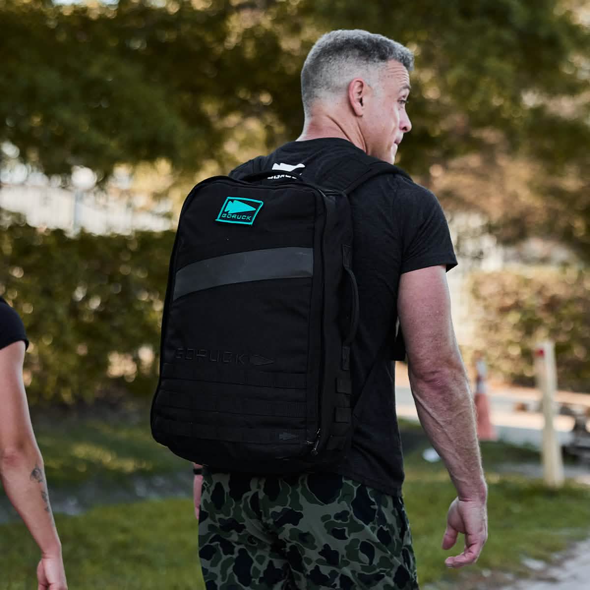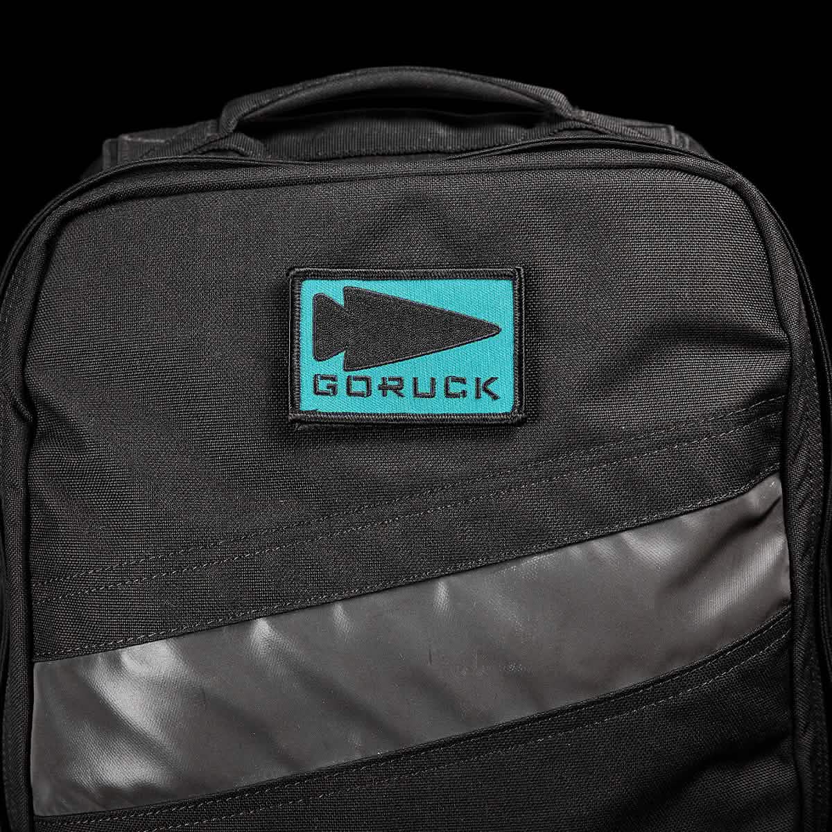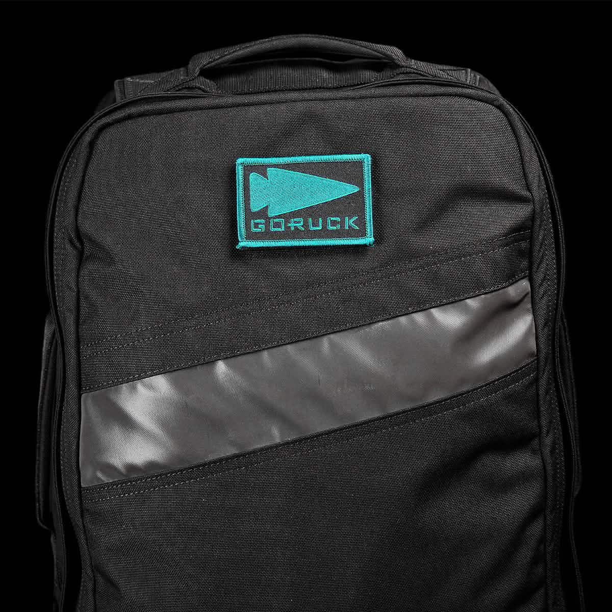 A black backpack featuring a teal GORUCK logo on the upper front and a diagonal reflective strip across the front pocket. It includes an embroidered GORUCK Spearhead patch for added flair, maintaining its subtle, rugged design against the black backdrop.