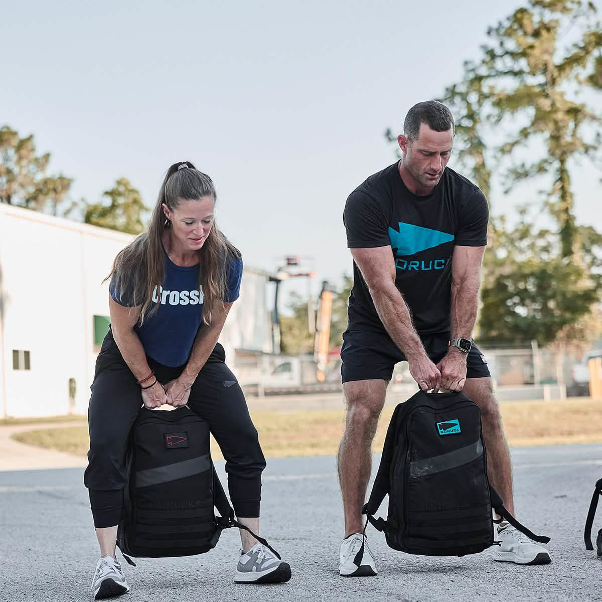 Two individuals are exercising outdoors, each lifting a weighted backpack with the Patch - GORUCK Spearhead by GORUCK. They stand on a concrete surface, framed by a white building and trees in the background, both focused intently on their workout.