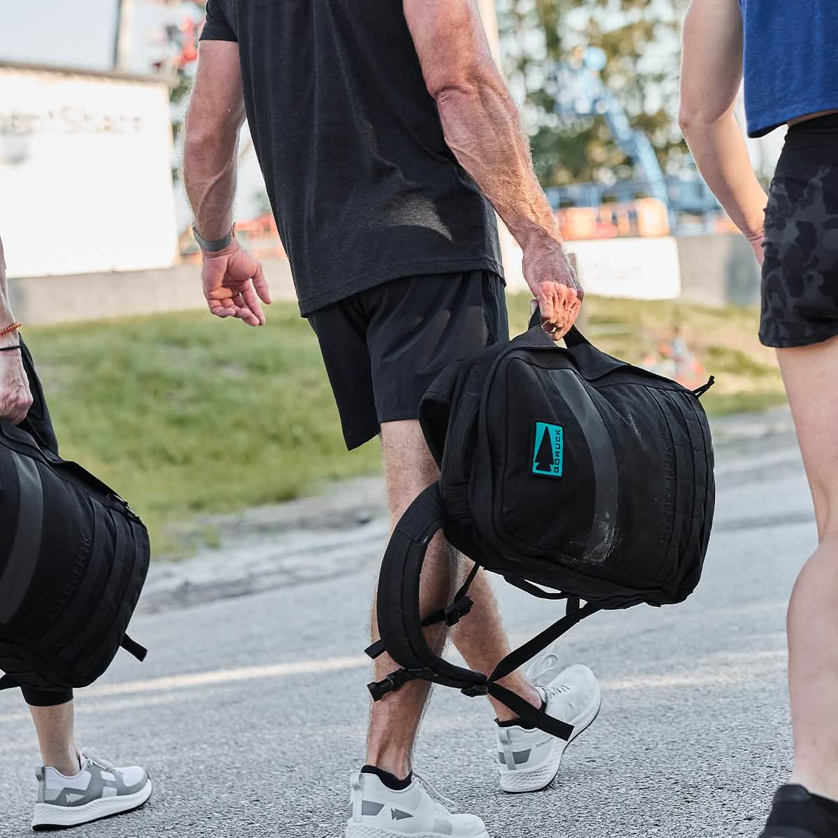 Three individuals strolling outdoors, each carrying a large black GORUCK backpack, adorned with an embroidered GORUCK Spearhead patch. They are dressed in casual athletic attire. The blurred urban background, interspersed with patches of grass, reflects their energetic lifestyle.
