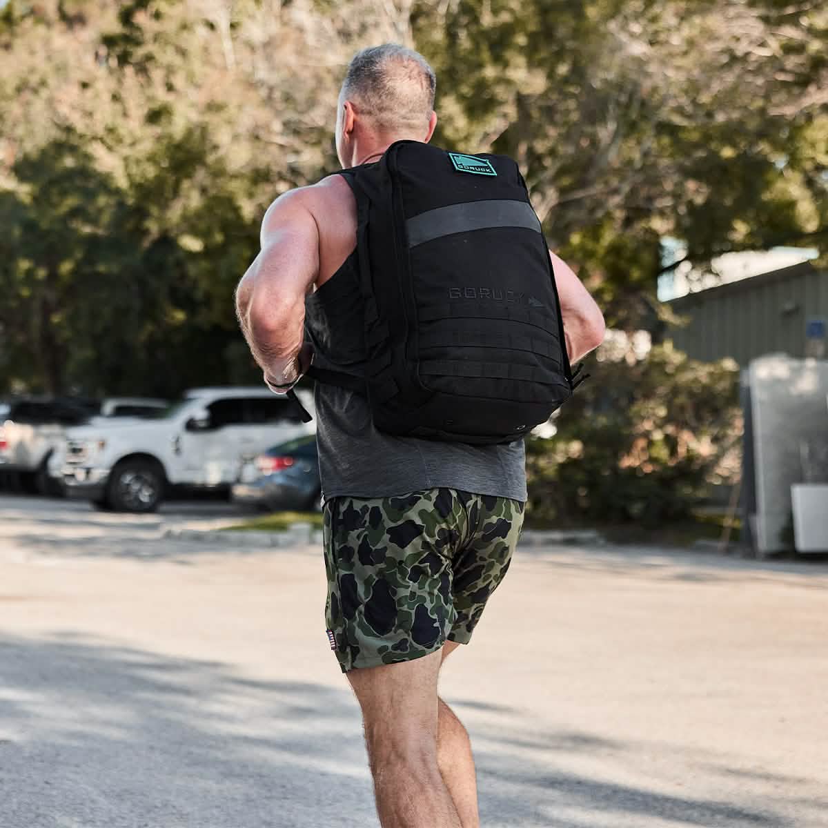 A jogger wearing a black backpack features an embroidered patch with the GORUCK Spearhead logo. They are styled in a sleeveless shirt and camouflage shorts, with trees and parked cars in the background enhancing the peaceful ambiance of their workout.